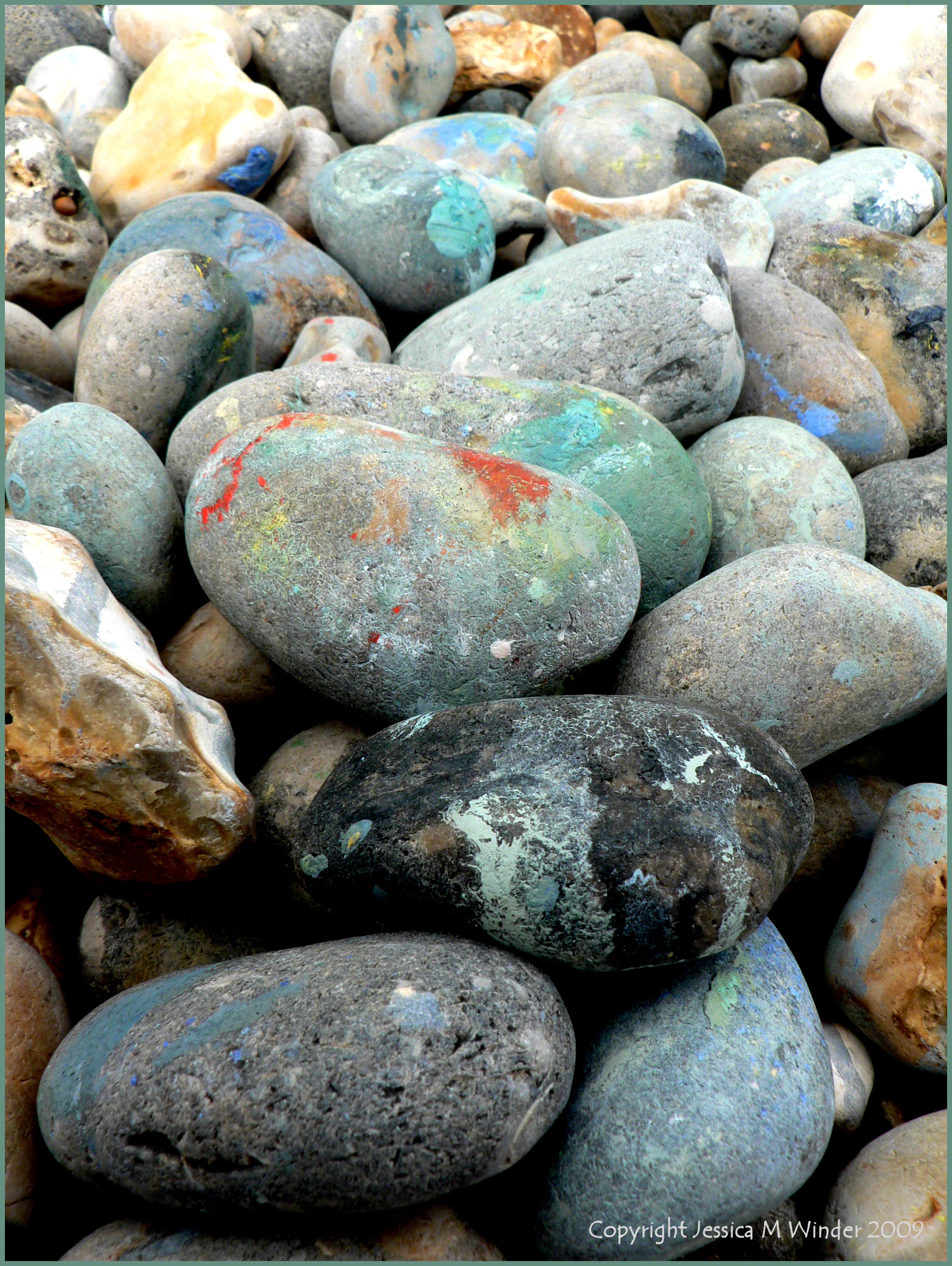 Paint on pebbles left by an artist at Ringstead Bay, Dorset, 2009.