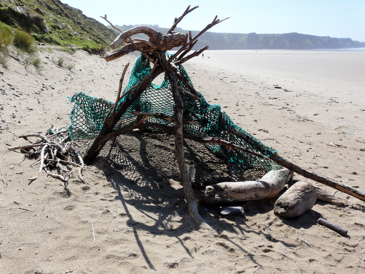 Kids’ den made of driftwood and fishing net flotsam from the strandline at Rhossili Bay, Gower, West Glamorgan in April 2009