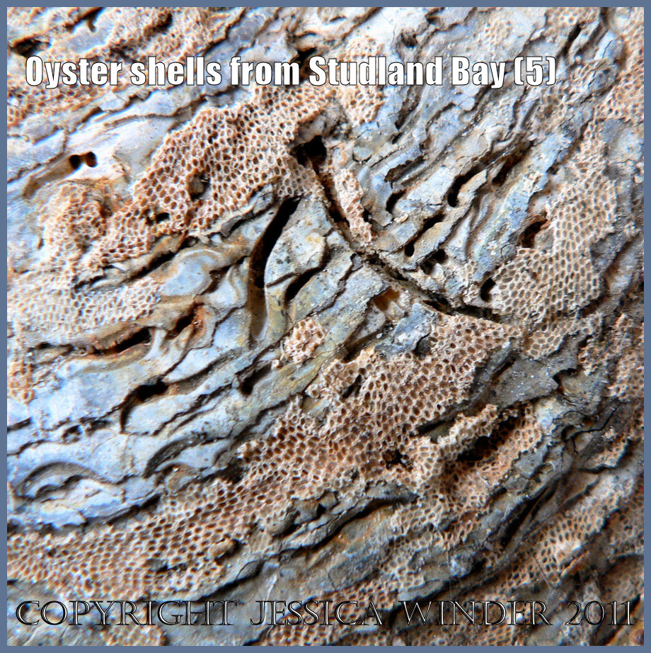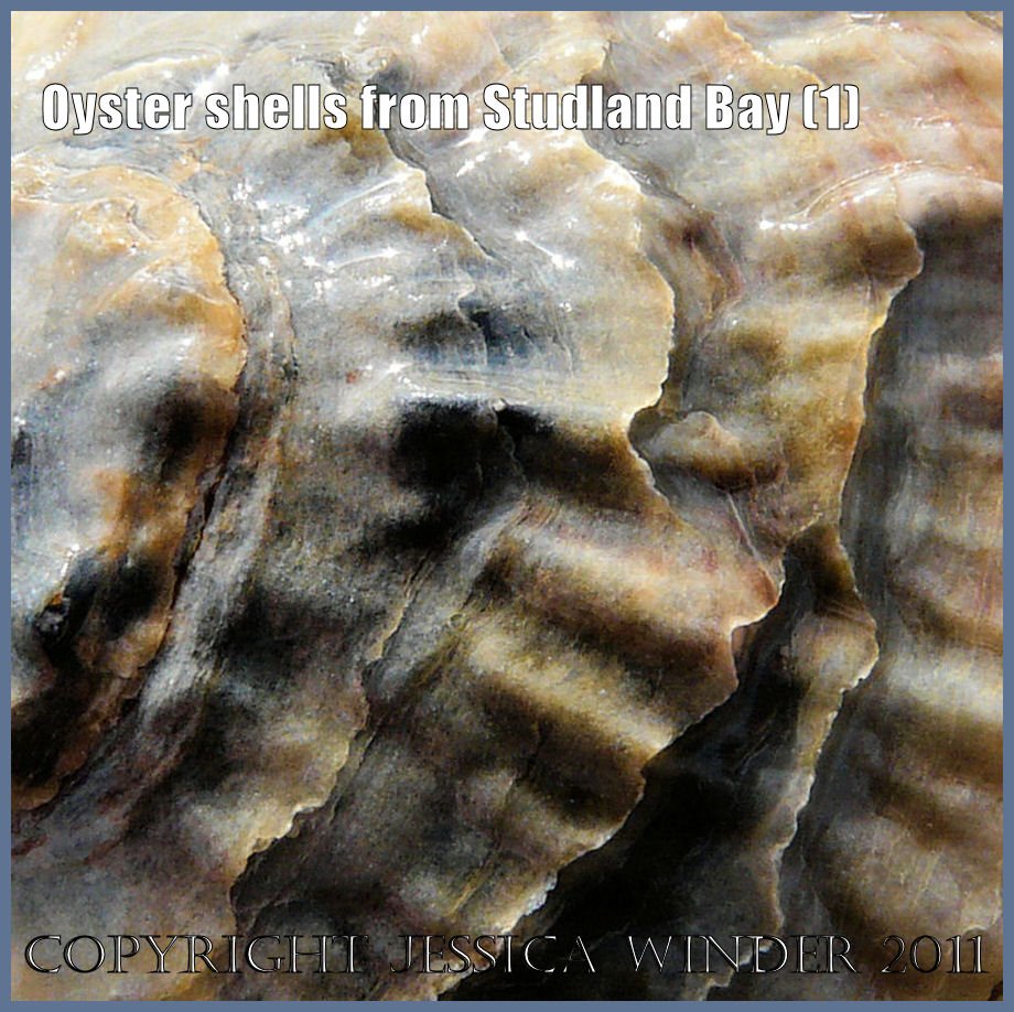 Oyster shells frequently wash up on the sandy beach at Studland Bay. Usually the thicker, older shells are the ones that survive the persistent pounding by the surf, the periodic burials, and the exposure to the elements. This means that the shells are often worn smooth. The shell in the photograph above has not been flotsam for too long – relatively speaking – because it still shows a lot of its original features.
