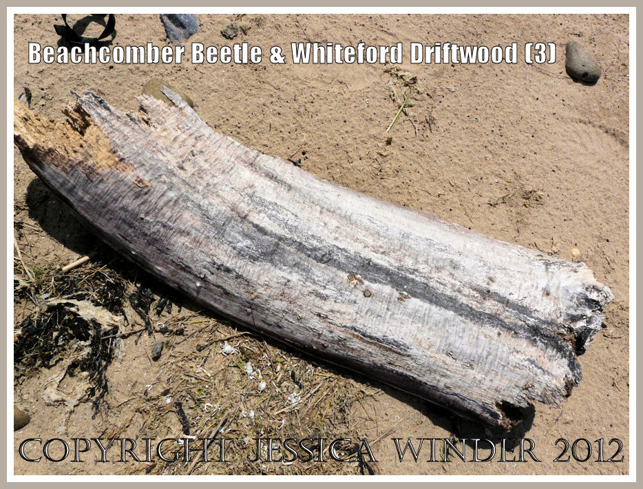 The photograph below shows in detail the black and cream colour, the striped pattern, and the satin-like wavy texture of the wood grain in the piece of driftwood. I do not know what type of wood this is but it is often found, sometimes as quite large pieces, in this area.