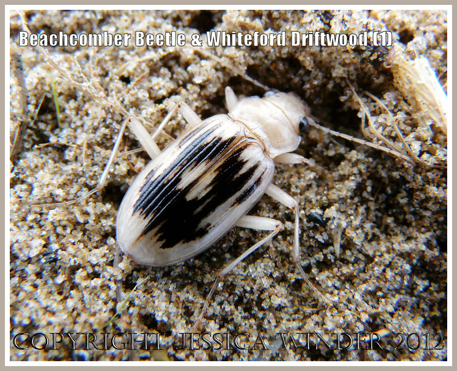 This photograph shows a cream and black patterned Strandline Beetle, Nebria complanata, on sand beneath a piece of driftwood at Whiteford Sands, Gower. This unusual beetle (also known as a Maritime Ground Beetle or Beachcomber Beetle) is a nationally scarce species that lives on the strandline along the shores of the Bristol Channel in the UK amongst seaweed and other rubbish. The beetles are between 17 and 24 mm long and hide under driftwood during the daytime and come out at nightime to feed upon small amphipods – such as the sandhoppers which are abundant on seashores.