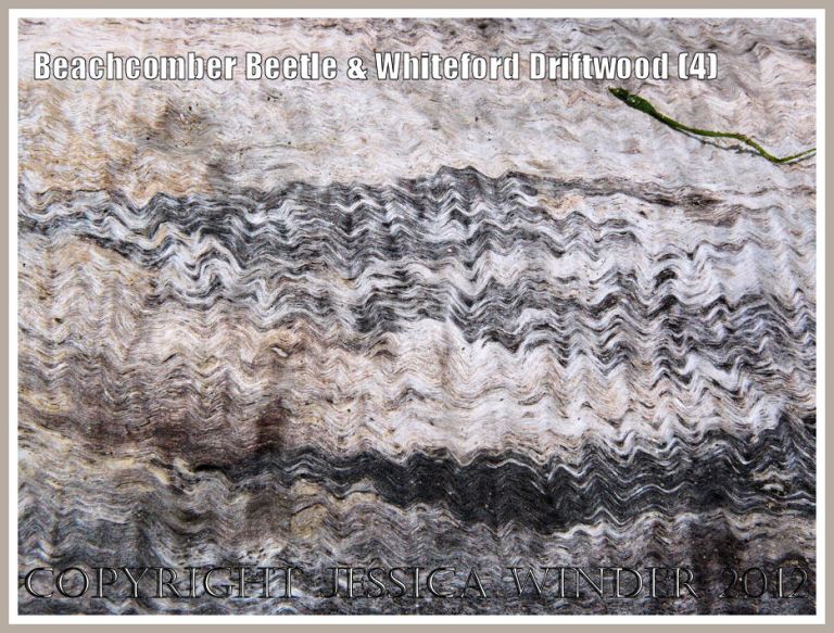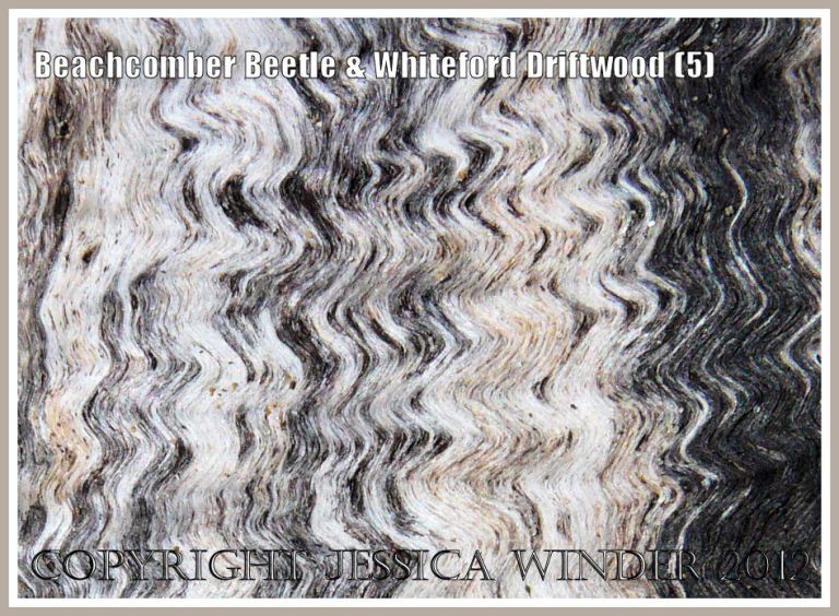 This is the very ordinary piece of driftwood under which the Strandline Beetles were hiding. A close look reveals that the timber also has very interesting black and cream patterns like the beetles’ elytra – with the markings representing the grain of the wood. The designs are superimposed upon an undulating surface of shallow ridges and furrows that have a satiny or silky texture. The overall effect very much resembles long tresses of wavy hair.