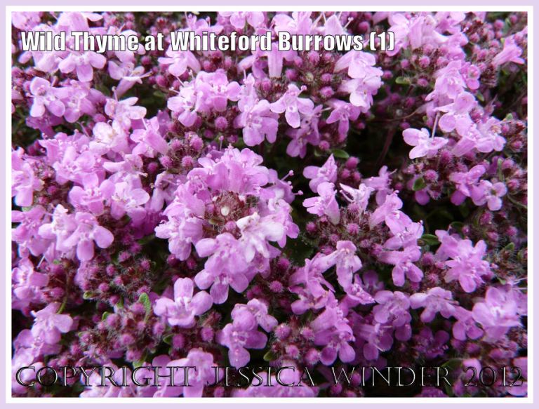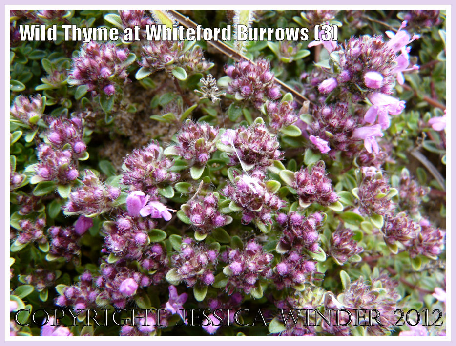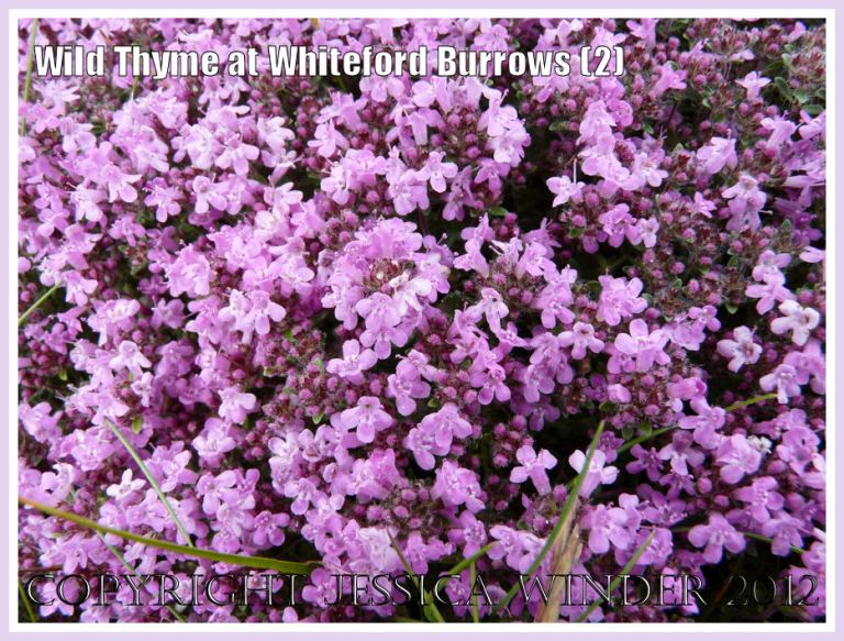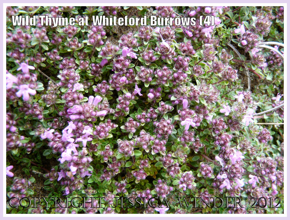 Pinkish purple flowers of Wild Thyme, Thymus polytrichus, on sand dunes at Whiteford Burrows, Gower, South Wales. Even the smallest of flowers was growing in great enough profusion in June to make a big contribution to the wonderful colourful floral carpets and natural arrangements at this nature reserve.