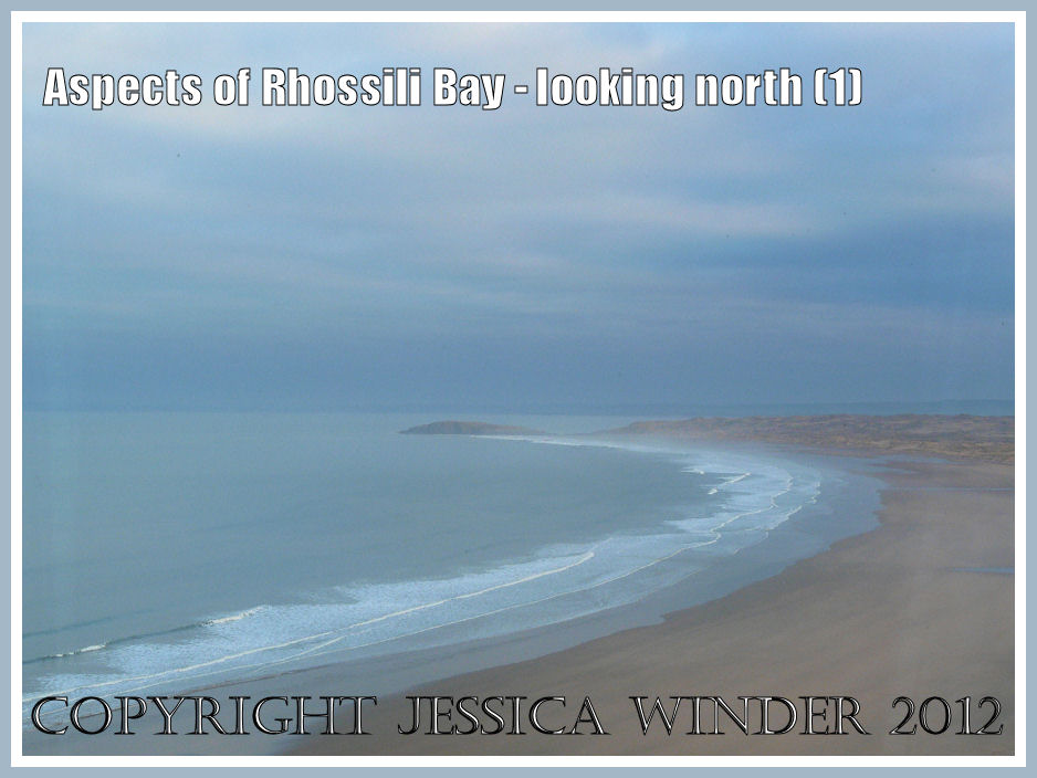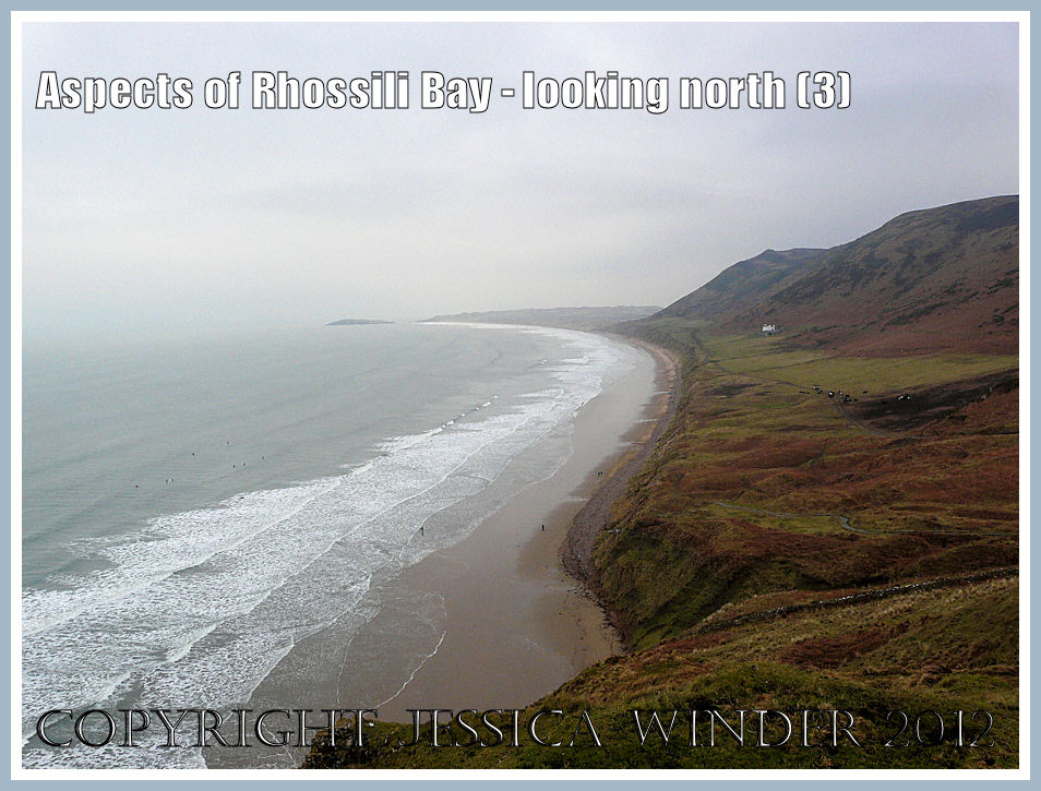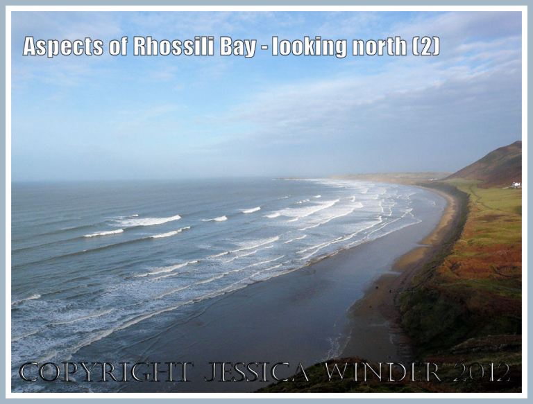 View looking north along Rhossili Bay, 1100 hours 14th February 2009. A slightly dull, misty, overcast day; sea quite high up the beach and the tide just starting to ebb; strange mixture of flat sea with lots of foam generated at the water’s edge; and one or two people on the beach to be followed by many more romantics on this Valentines Day.