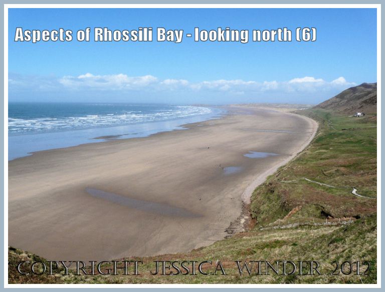 Below, a springtime view looking north along Rhossili Bay, Gower, 1234 hours 8th April 2009. Promising to be a great day; mostly blue sky with only a narrow band of clouds on the horizon; it has been a very low tide but on the turn now; not a lot of vegetation on the cliffs yet even though it is spring; one or two people already on the sand; can’t wait to get down there myself.