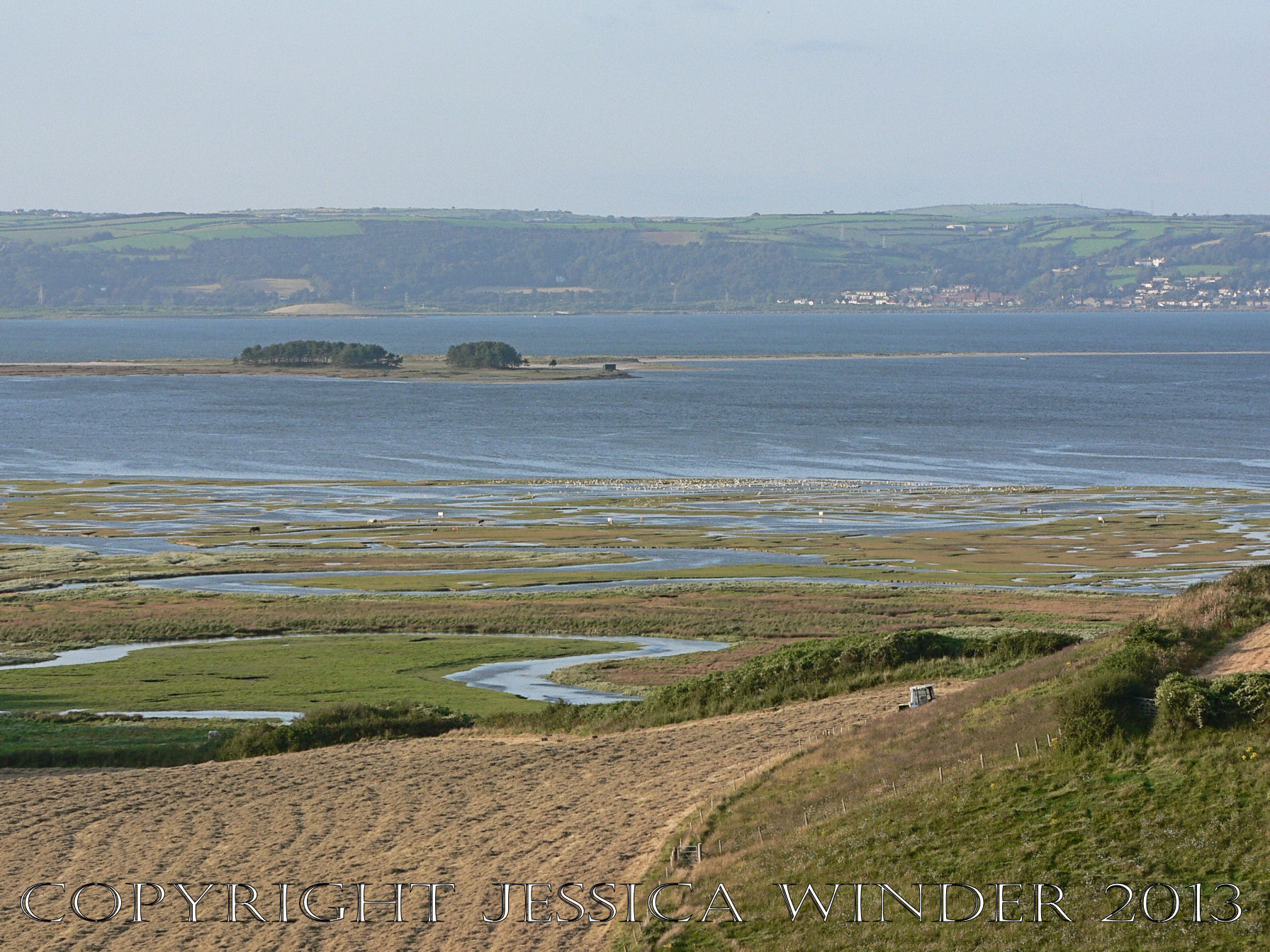Saltmarsh Sheep at Whiteford (6) – View from Llanmadoc Hill of Landimore Marsh flooded at high spring tide with Bergins Island and Whiteford National Nature Reserve beyond. June 2009. P1080031aBlog6
