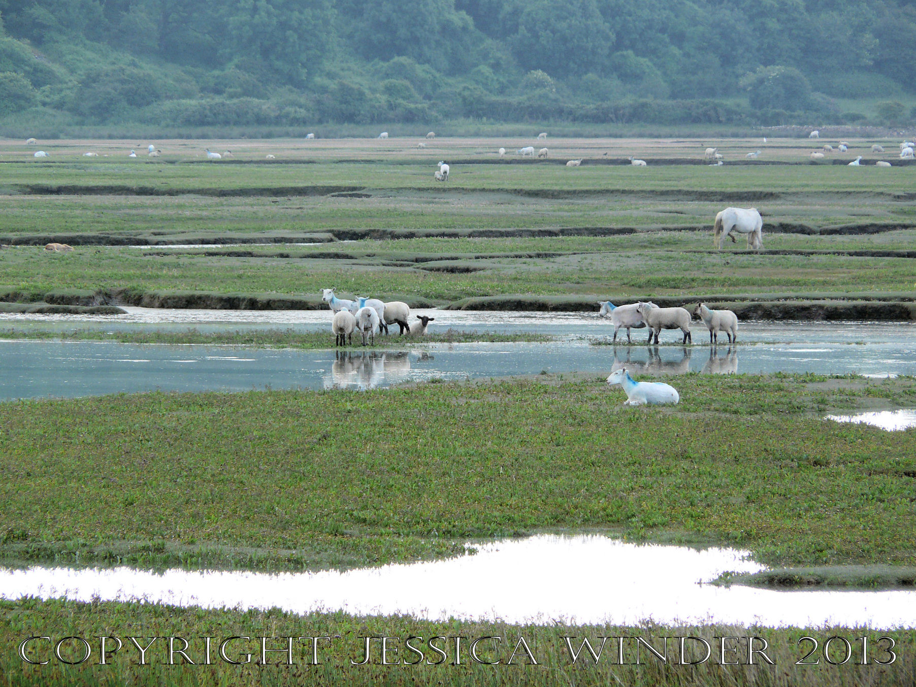 Saltmarsh Sheep at Whiteford (13) – Sheep standing in seawater of flooded saltmarsh channels on Landimore Marsh at spring tide, part of Whiteford National Nature Reserve, Gower, South Wales, June 2009. P1110650aBlog13