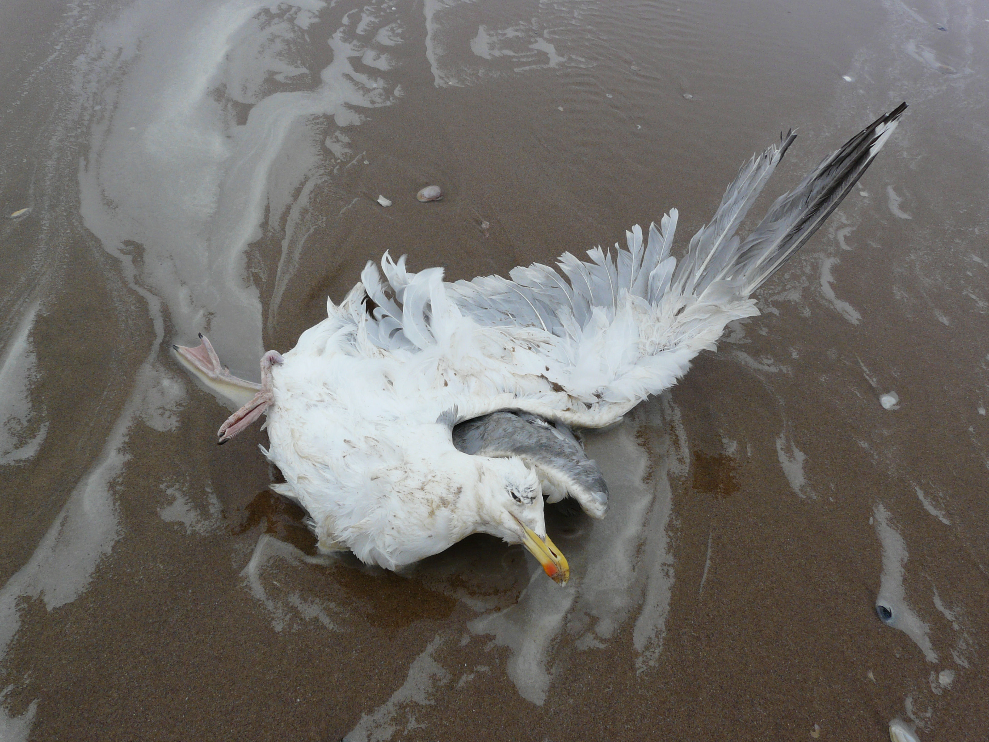 Dead seagull washing up on the sandy seashore at Rhossili, Gower, South Wales. P1130364a Dead seagull washing up on the sandy seashore at Rhossili, Gower, South Wales.