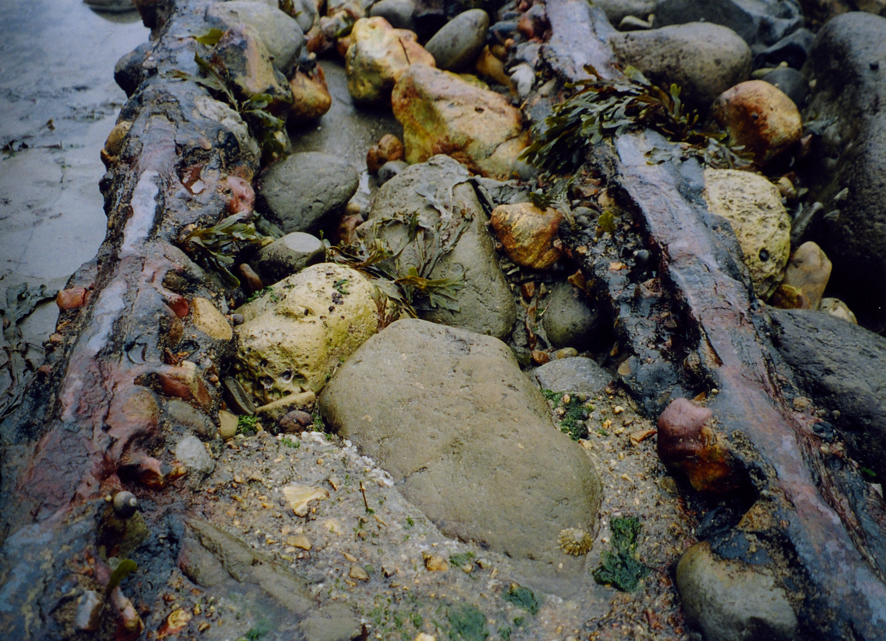 Rusty remains of a railway line on Monmouth Beach at Lyme Regis in Dorset, England.