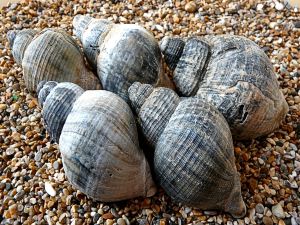 An arrangement of blackened Common Whelk shells from Gower, South Wales. P1160418a An arrangement of blackened Common Whelk shells from Gower, South Wales.
