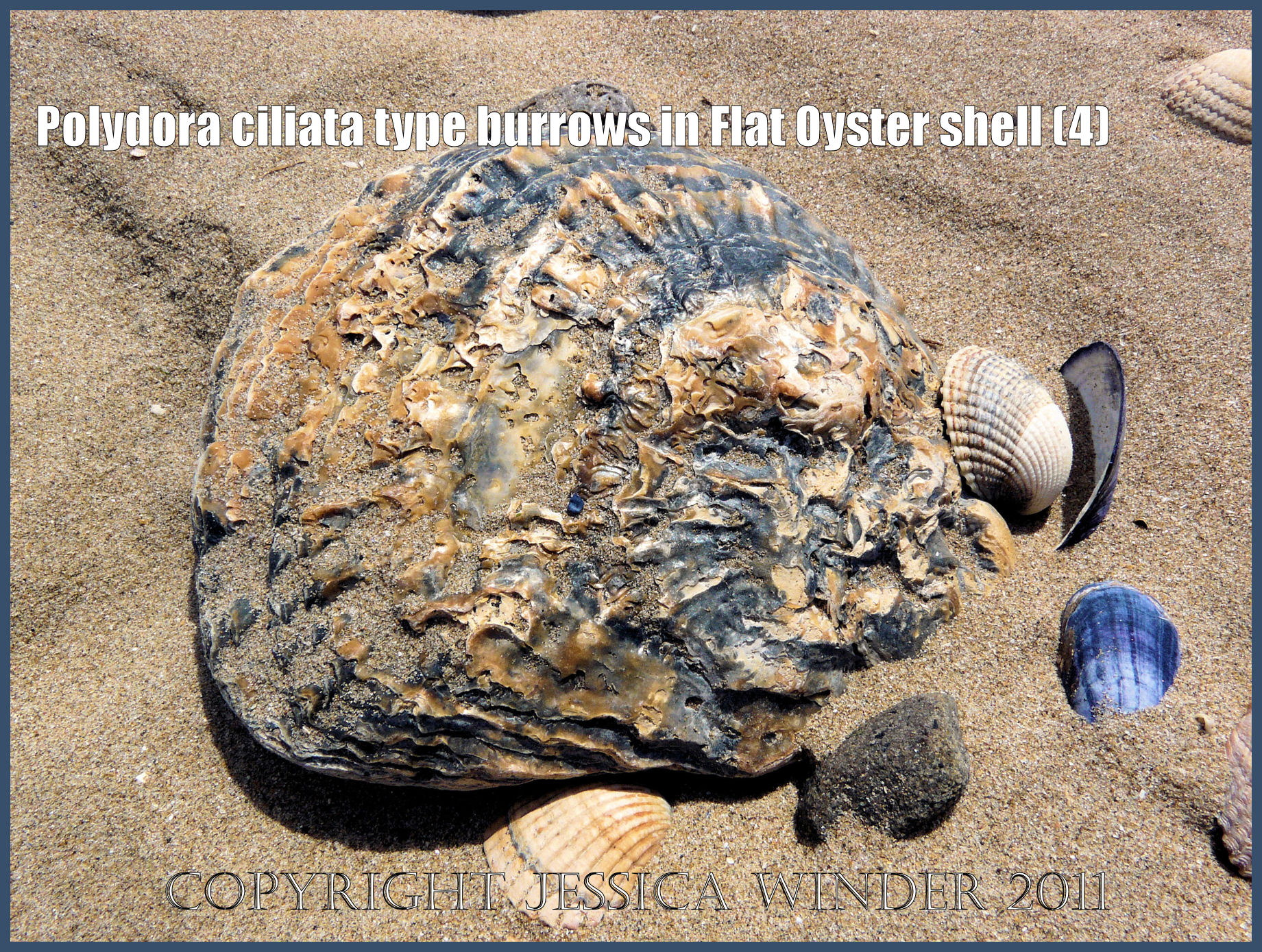P1160682aBlog2 Close-up left valve external surface of a Flat Oyster shell showing damage by the marine worm Polydora ciliata, from the beach at Whiteford Sands, Gower, South Wales (2)