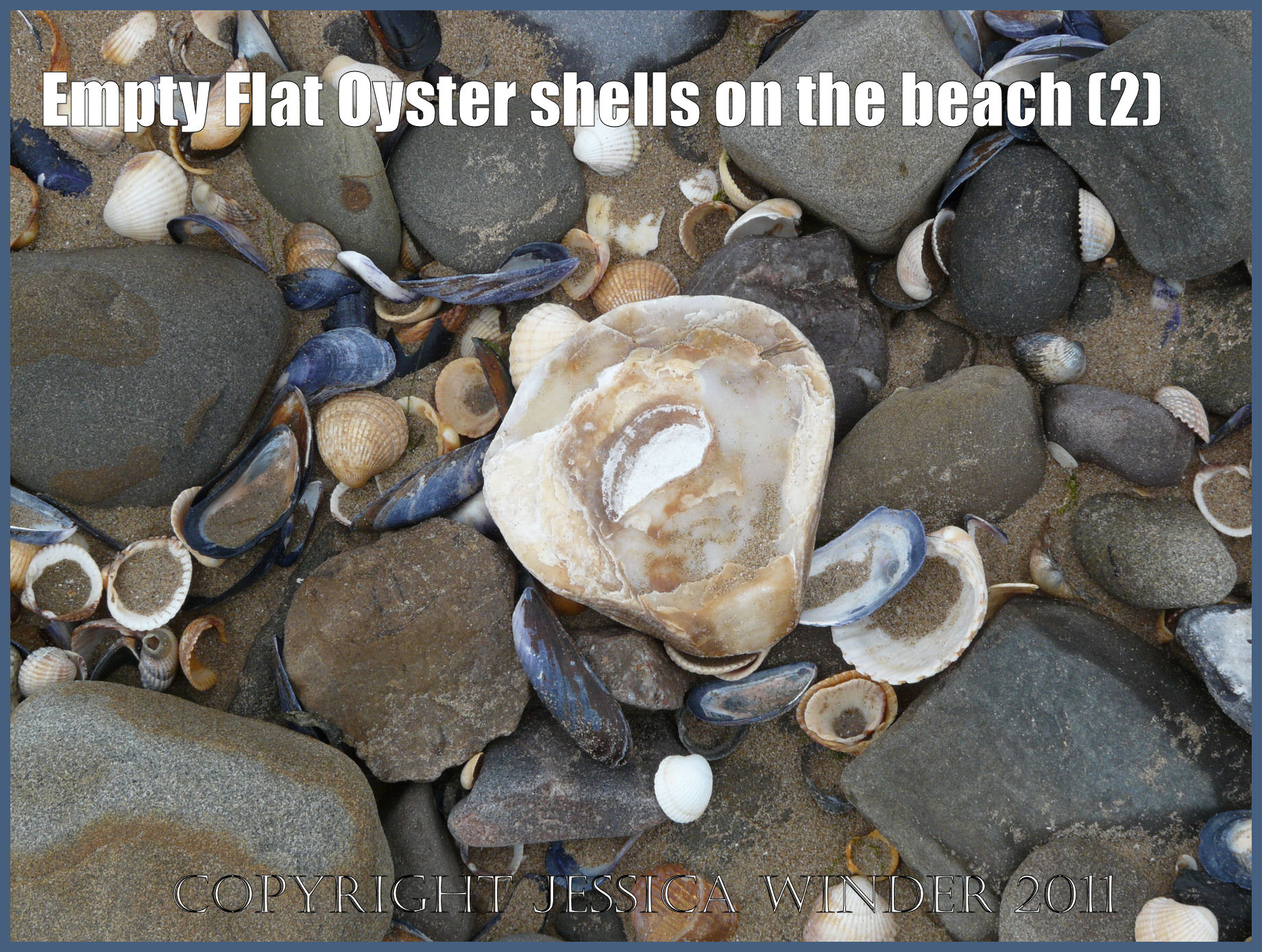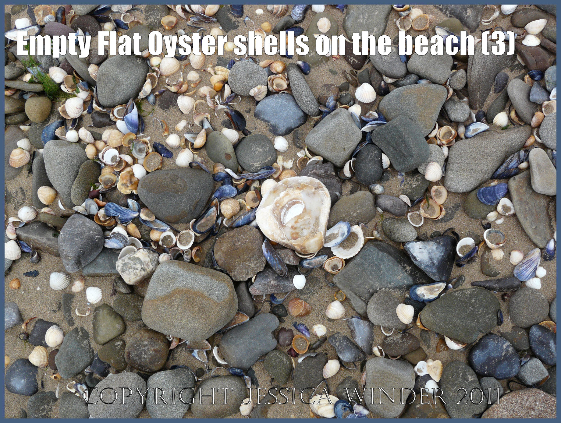 This is the first post on EMPTY FLAT OYSTER SHELLS ON THE BEACH in which the photographs will demonstrate in a general introductory way some of these macroscopic variations in the shells. All the pictures will show the oyster shells in situ just as they were found on the seashore.