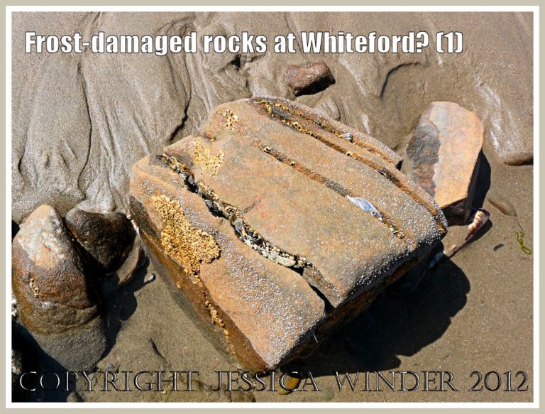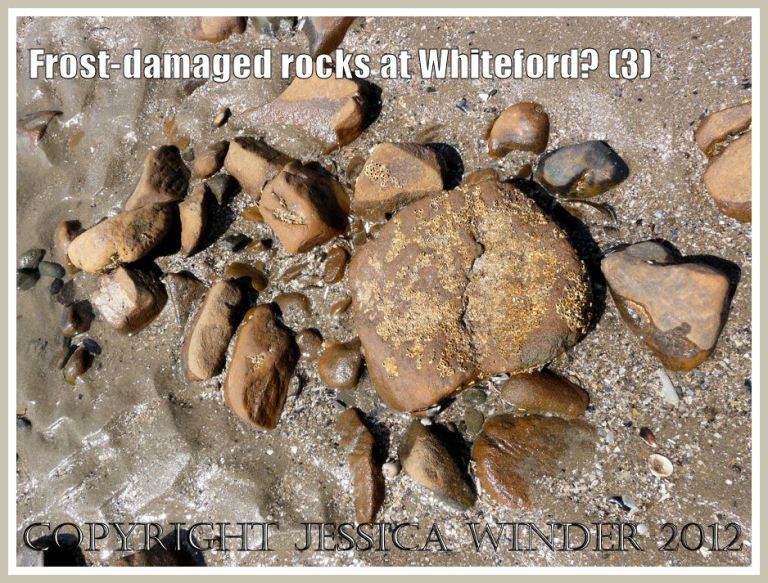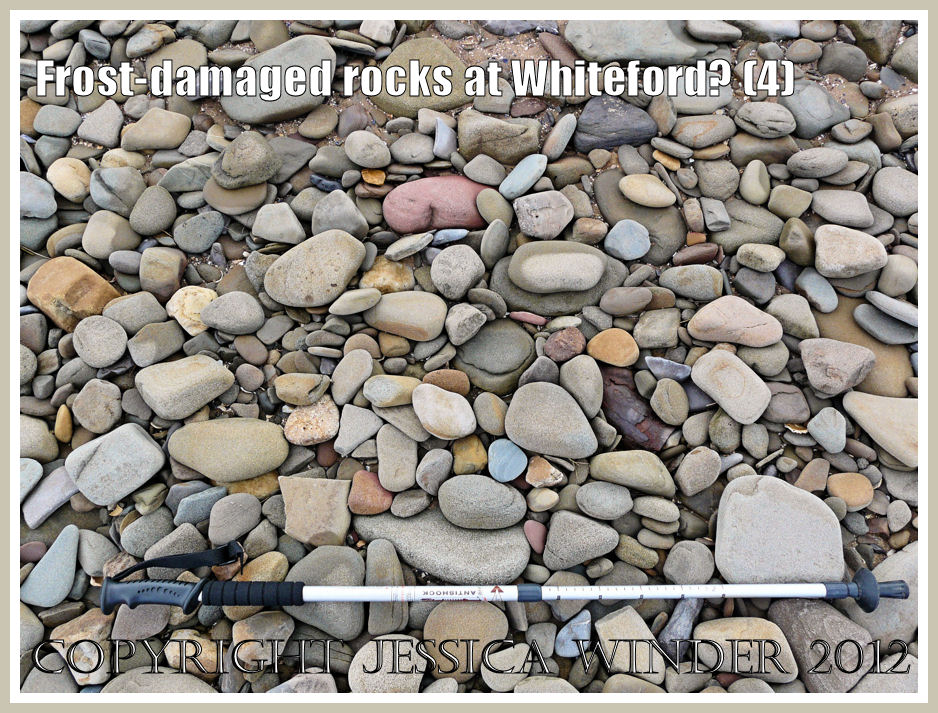 In the previous post I mentioned the glacial till exposure near Whiteford Point, Gower. According to expert accounts, some of these rocks show frost damage caused by the ice sheet and the icy conditions 17,000 years ago. The photographs in this post illustrate what I believe to be some of these frost-damaged rocks. The stones in the first two pictures, exhibit multiple parallel splitting. The third image shows a stone, maybe of a different type, with a single crack. It is easy to imagine how the smaller pieces of stone that cleave from these rocks end up as the large, flat, smoothed pebbles so typical of the beach further along to the north east. The final picture shows some of these pebbles with my walking pole to give scale.