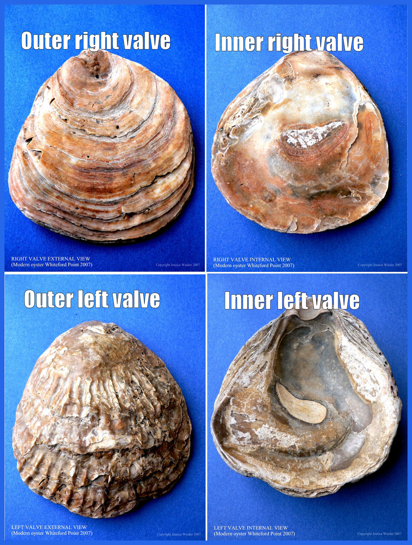 The photographs below (on the blue back-ground) show a right and a left valve – not a pair from the same oyster but similar in size and age. These modern beach-worn shells were collected at Whiteford Sands, Gower in South Wales. Both the external and internal surfaces of the shells are shown. These are very mature, thick and heavy specimens with the edges and the outer surfaces worn smooth [unlike the sharp edges and detailed sculpturing exhibited by the young specimen shown above].