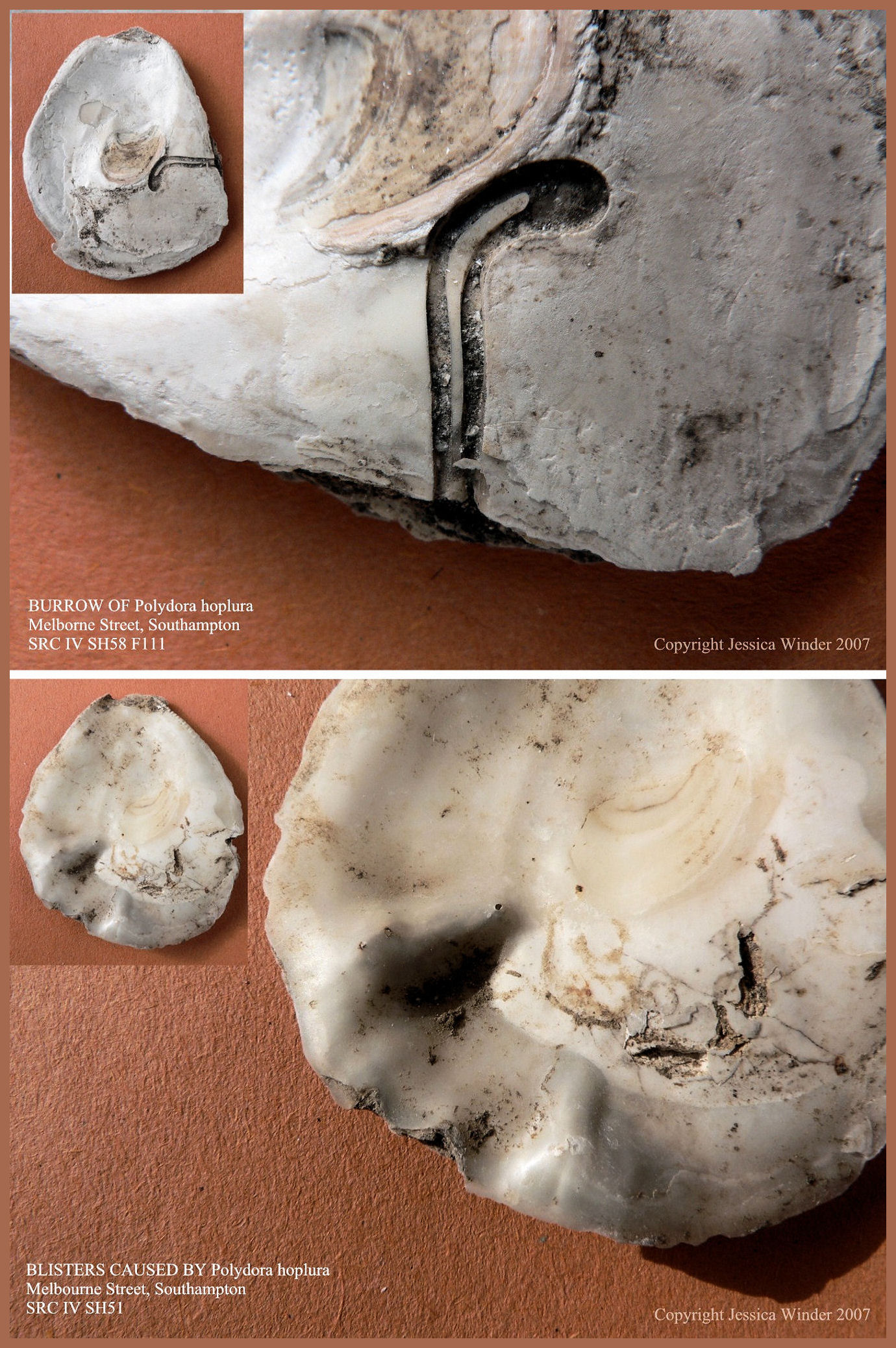 The evidence for infestation by Polydora hoplura Claparede in European Flat Oyster shells (Ostrea edulis Linnaeus) is distinct from that caused by the related but smaller marine polychaete worm Polydora ciliata Johnston. [This kind of damage was described in the earlier post Ancient & modern Polydora ciliata type burrows in Flat Oyster shells].