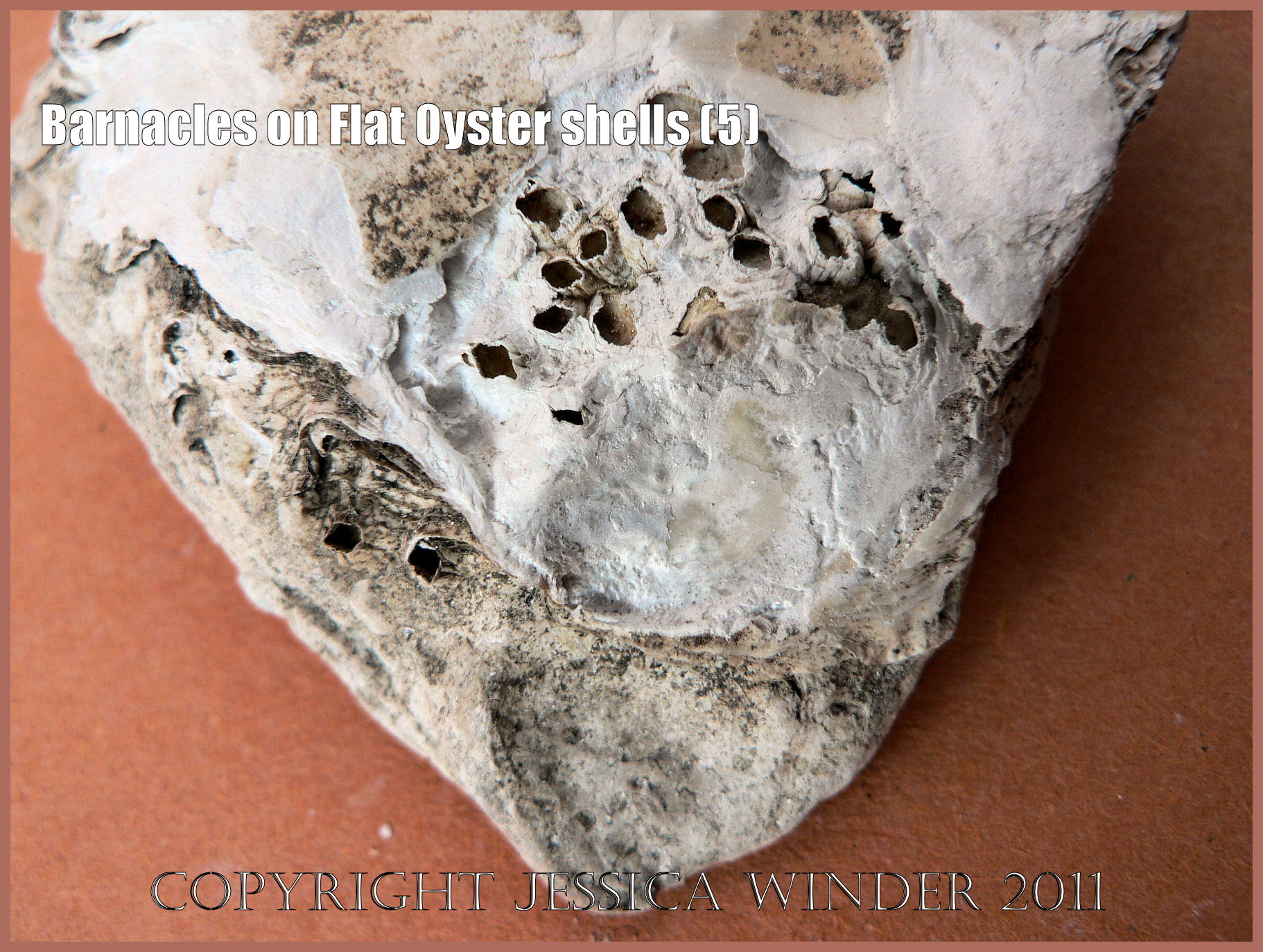 The photographs below show a range of both modern and archaeological European Flat Oyster shells with emedded barnacles. The barnacle shells are inverted and the basis absent. It is possible in some specimens to see all the side and opercular plates inside the hollow cone of the barnacle shell. The shape of the barnacle plates is diagnostic for the species. Identification of the particular type of barnacle is theoretically possible.