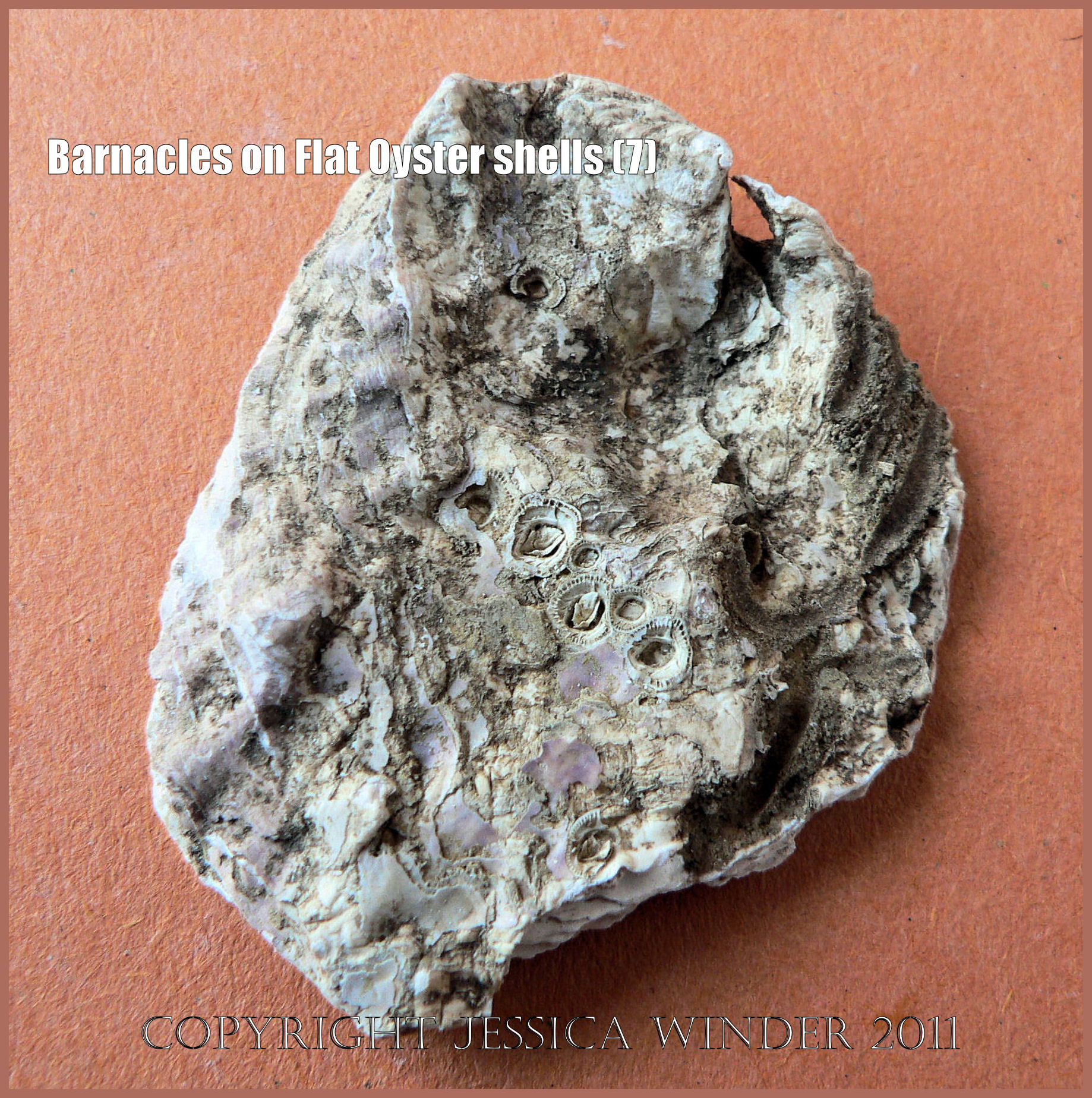 In certain circumstances, acorn barnacle shells can actually become incorporated into the shells of Flat Oysters. This usually happens when a young oyster settles on a stone or shell that is already encrusted with barnacles. The shell may be empty or may still be occupied by the living animal. The young oyster grows over the barnacles and, as its shell develops, the barnacles become embedded. This means that the calcareous plates of the acorn barnacle are preserved within the oyster shell.