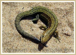 A Common Lizard (Lacerta vivipara) sitting in a heart shape on the hot dry sand at Rhossili Bay, Gower, West Glamorgan, UK. P1000123aBlog1