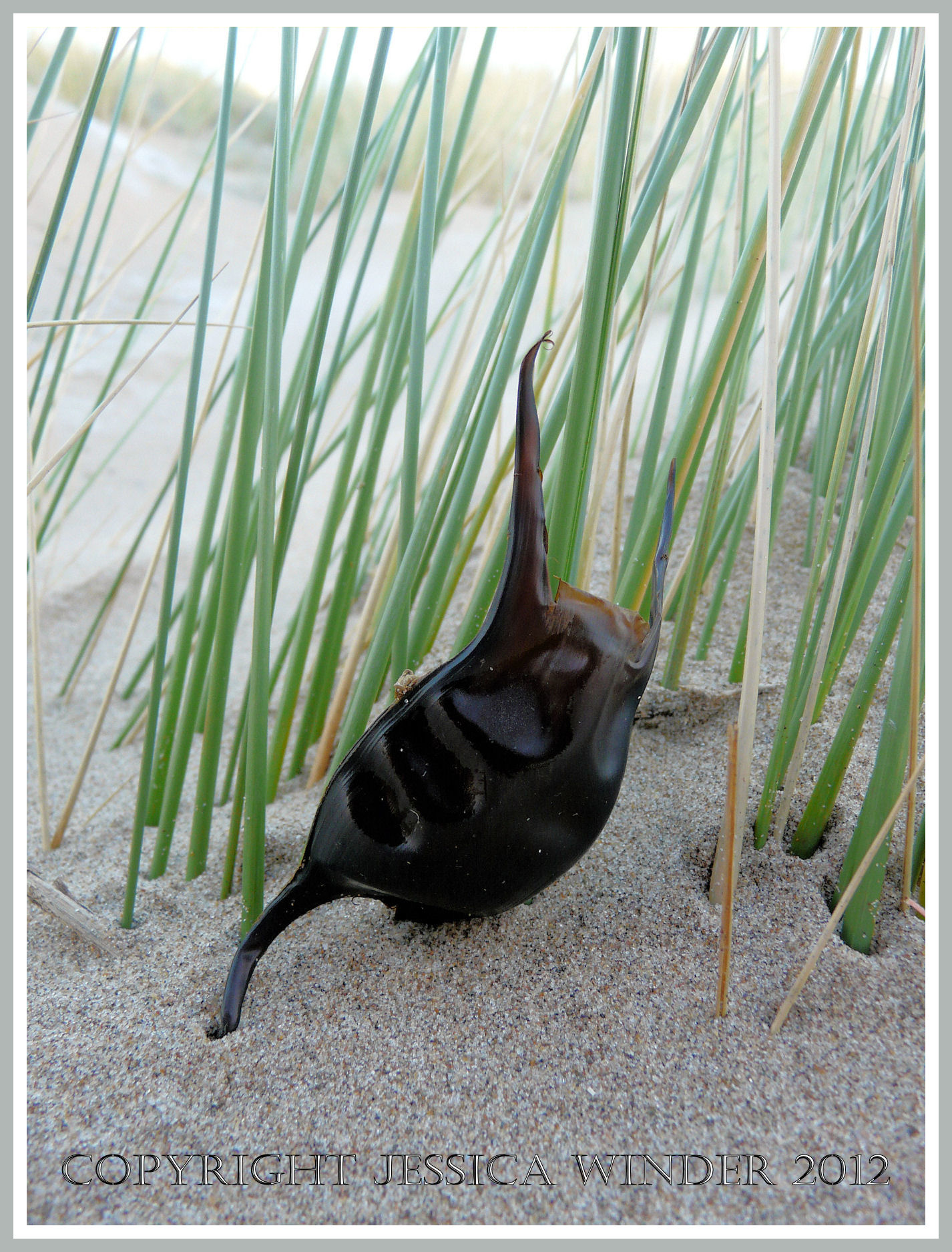 An empty skate egg case, or Mermaid’s Purse, caught up in marram grass on frozen sand dunes at Broughton Bay, Gower, South Wales, New Year’s Day 2010 (1) P1210289aBlog1