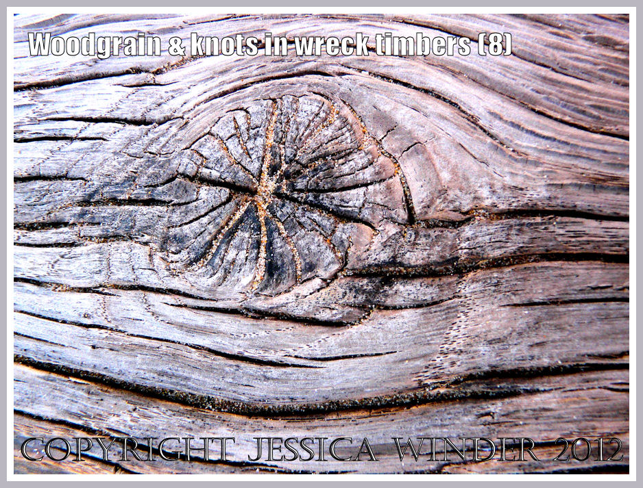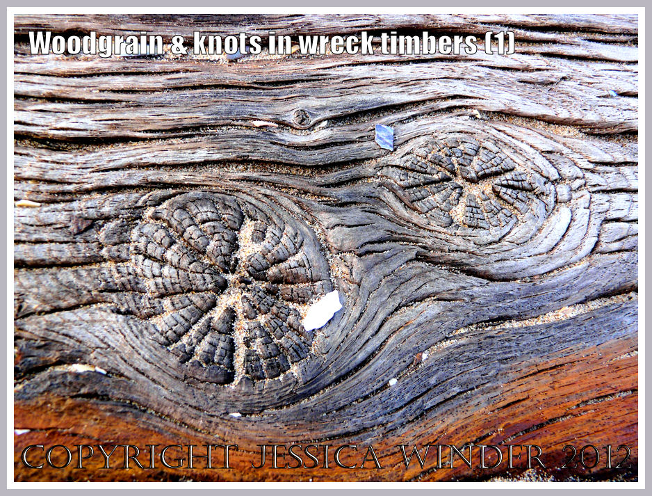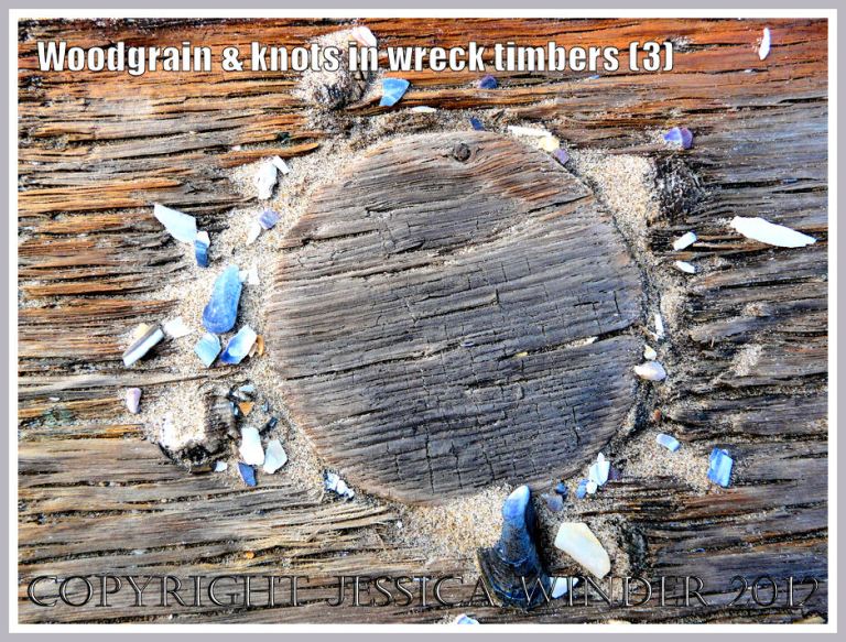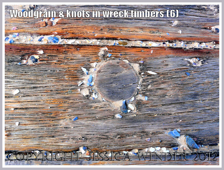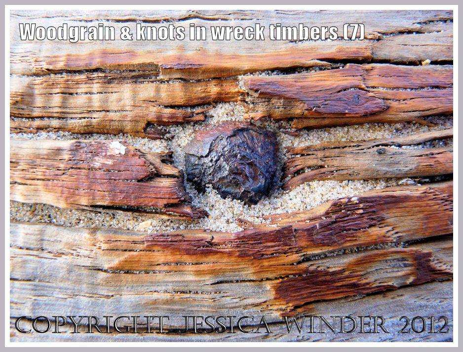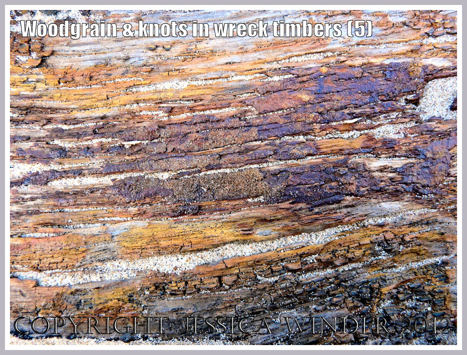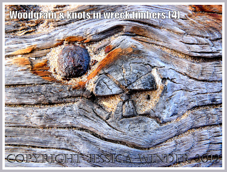 Old timbers provide a fascinating array of textures, patterns and colours. These photographs show some details of the planking on an old boat wreck on the beach. The grain of the wood has opened up with the weathering process. In the knots, the wood has split into radiating segments like the muscles in the iris of an eye. Most of the paint has been abraded by wind-blown sand but a few layered flakes of pale blue and pink colour remain. The brightest colouring results from the corrosion of large iron rivets or nails. The rust has seeped out into the surrounding timber and stained it bright orange and in some places has given it a varnished texture.