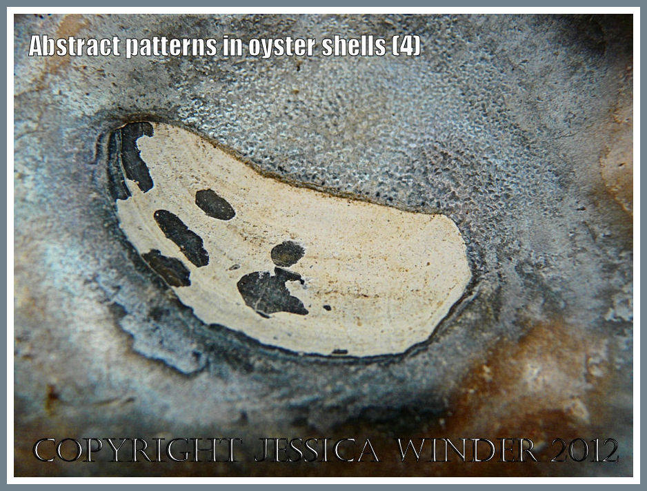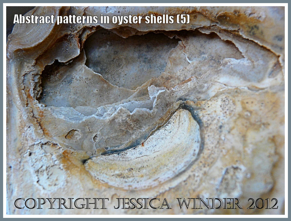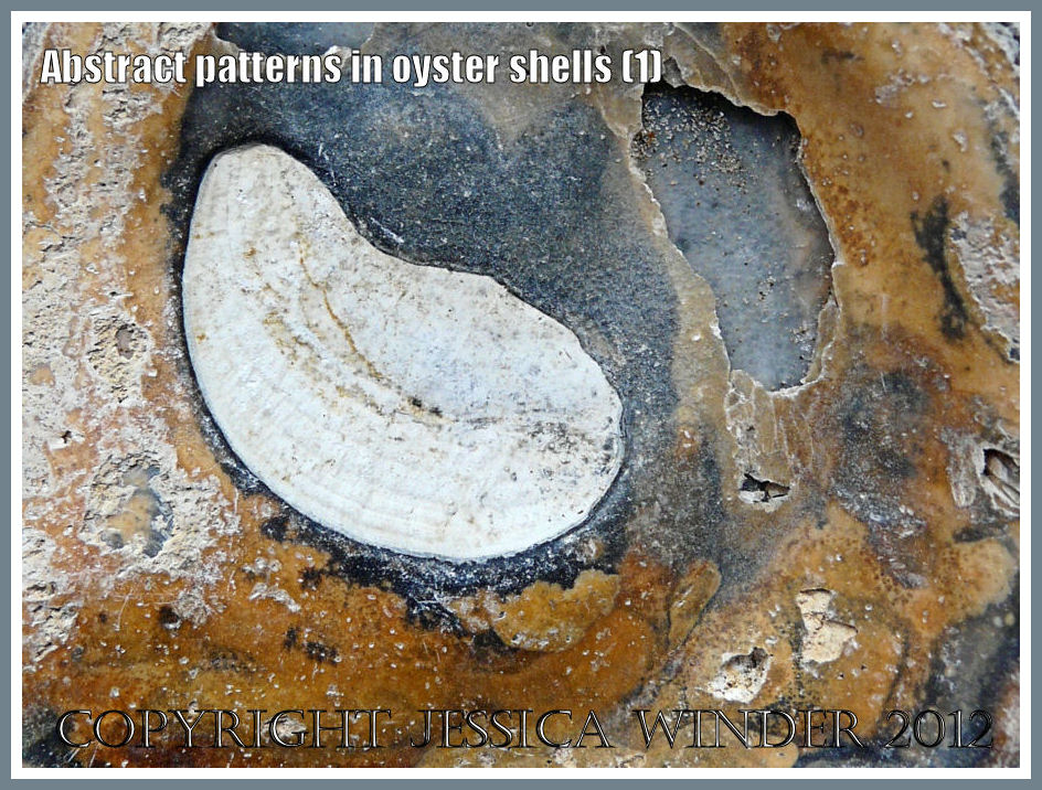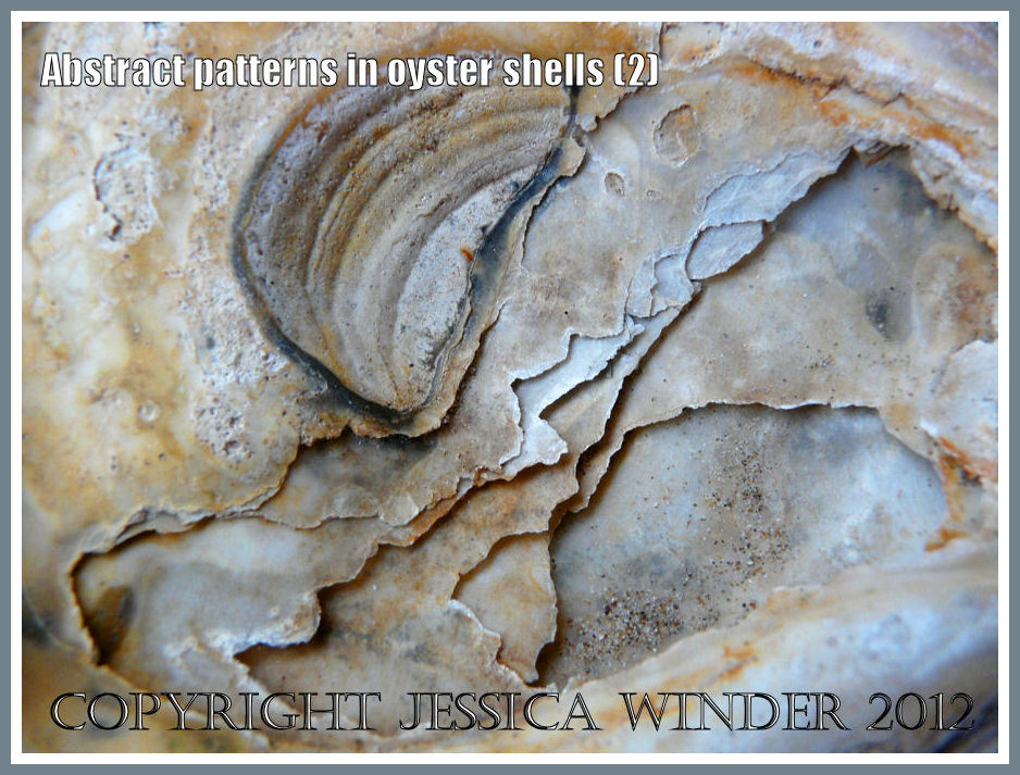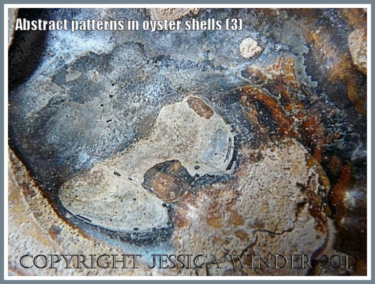 These are not random patterns. The patterns reflect specific functions, intrinsic physical and chemical compositions, different crystal structures, life history, post-mortem conditions, and taphonomy of the shells. All the specimens were the same species of mollusc, found in the same general location but their appearance tells of different individual experience. Seen at this level of detail, the varying designs, colours, and textures seem like abstract art.