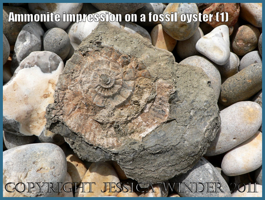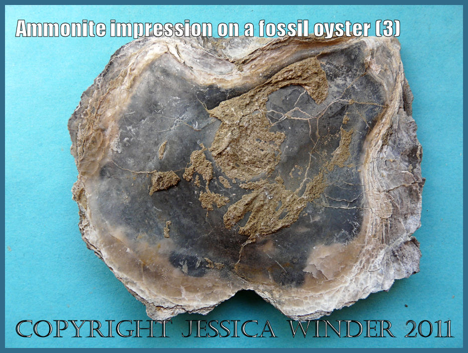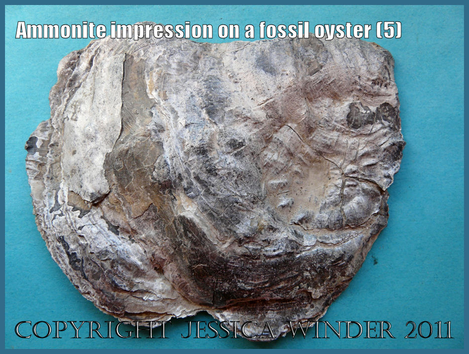 The left valve is often lowermost and the oyster cannot change position when the settlement substrate is a permanently fixed rock. On the other hand, if the oyster larva settles on a loose object, like a shell or stone, then stormy waters can potentially tip it over and turn the oyster upside down. This could have happened with this fossil oyster and would account for ammonite impressions on both the right and the left valves.