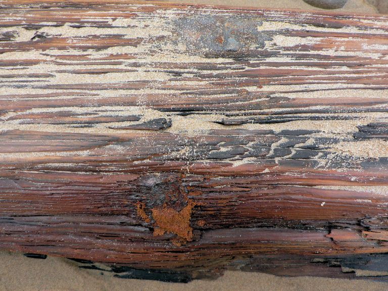 This sodden and weathered wood is from the keel and ribs of a shipwreck that lies hidden beneath the sand for most of the time. Just occasionally, when strong seas shift vast quantities of sediment and redistribute it across the shore, do you get a glimpse of these fantastic timbers. In some places, the wood is slowly rotting and separating down the grain into thin leaves or layers. In other parts, the edges have been broken down to stumps and the surfaces smoothed by the abrasive action of the sand and the pebbles that grind against them.