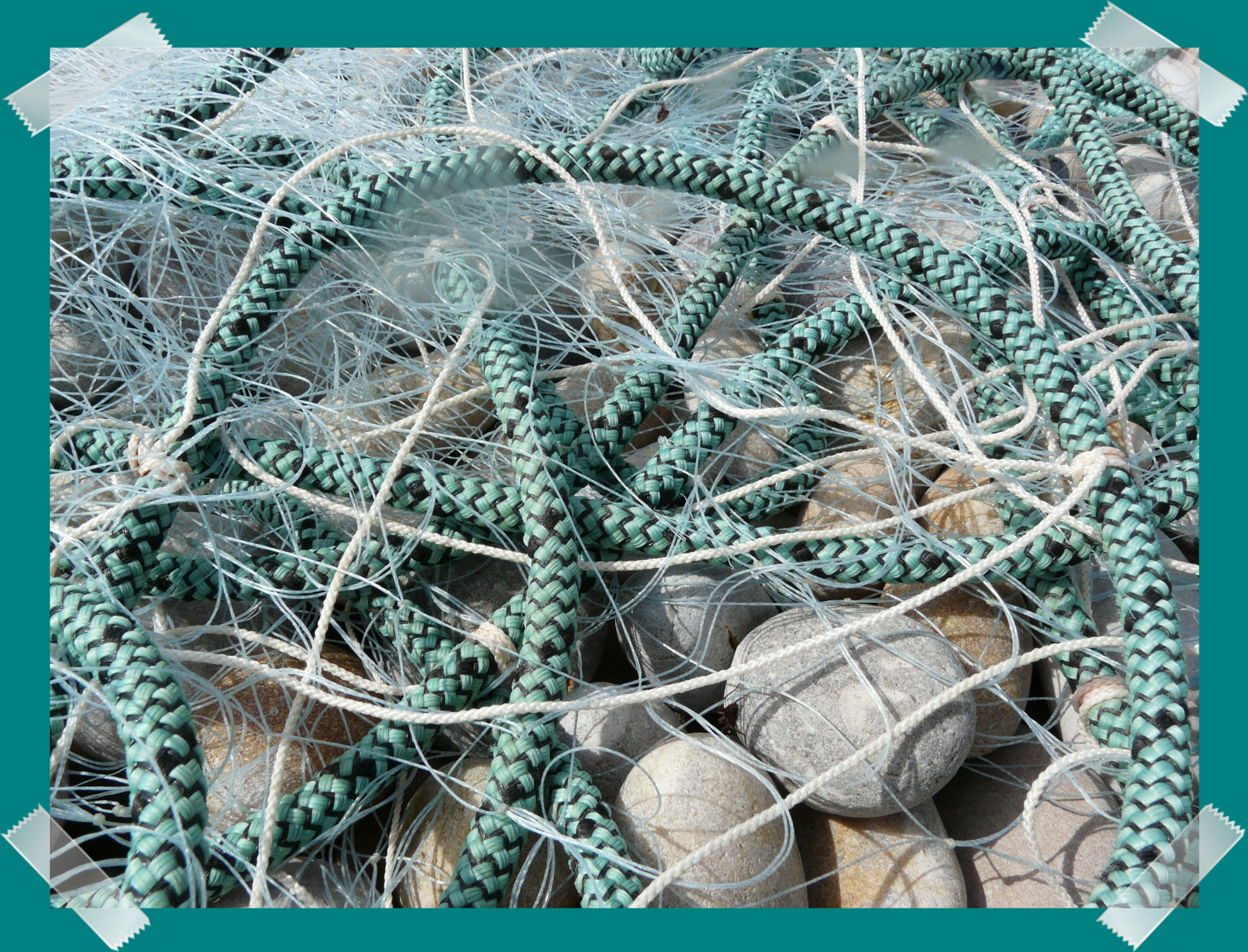 Just a snapshot of green and black braided rope, with pale blue nylon monofilament fishing net, left by local fishermen to dry on pebbles of the shingle bank at Chesil Cove, Dorset, UK on the Jurassic Coast.