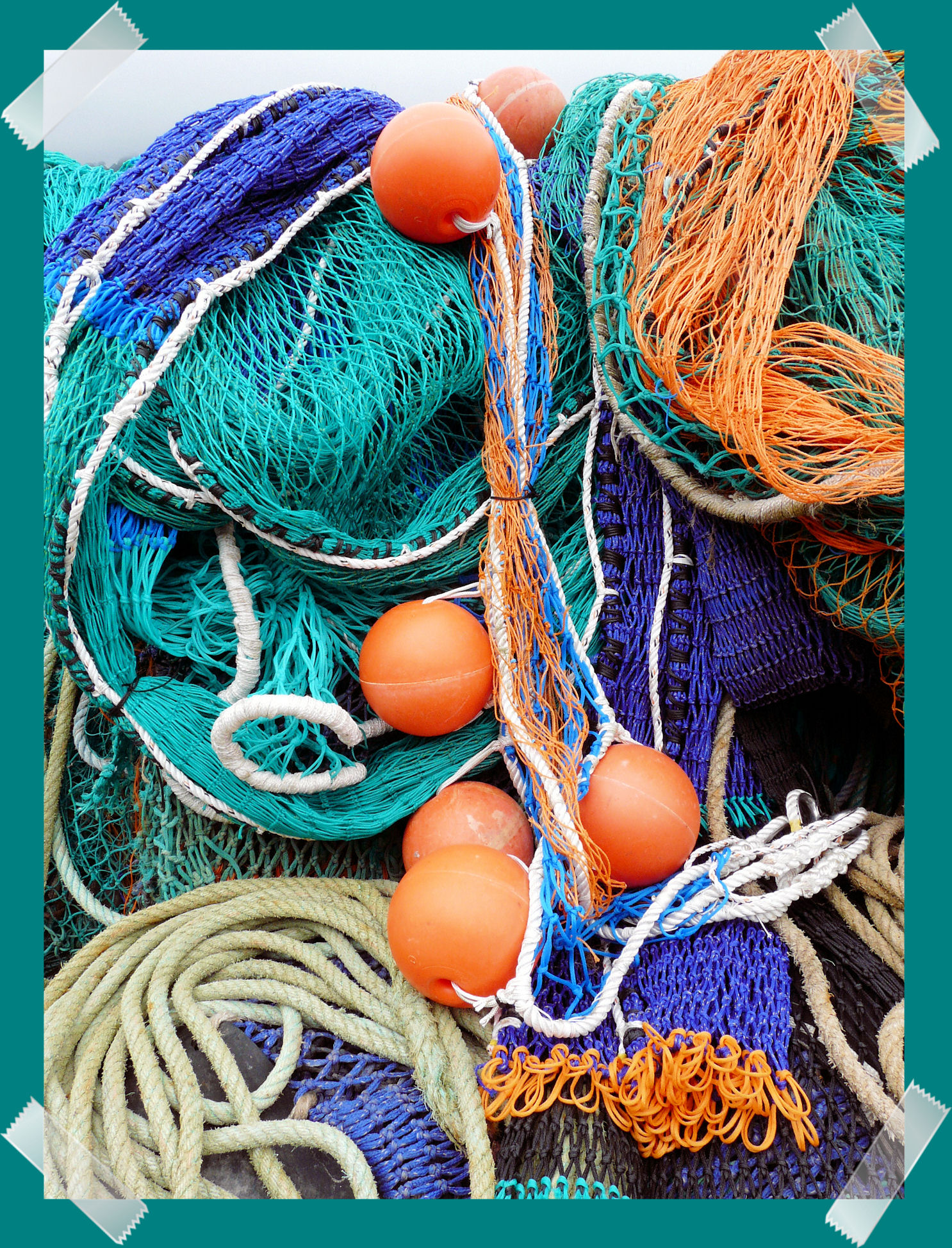 Just a snapshot of brightly coloured, blue, green and orange fishing nets, with ropes and floats on The Cobb at Lyme Regis, Dorset – part of the Jurassic Coast.