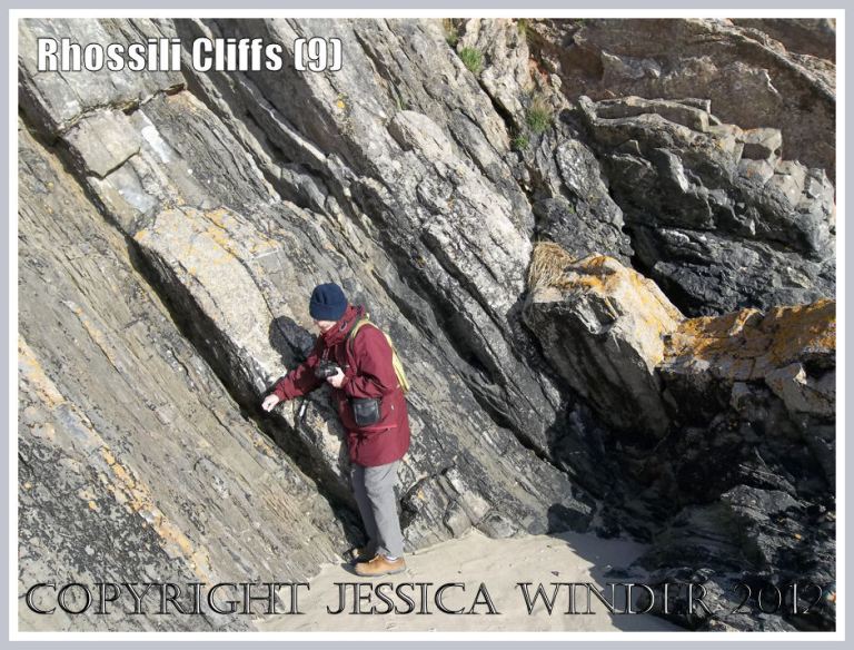 Steeply inclined, rugged, and sombre, the cliffs at the south end of Rhossili Bay make a dramatic contrast to the grassy slopes of Rhossili Down and the wide, gently shelving expanses of the sandy beach.
