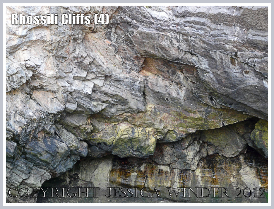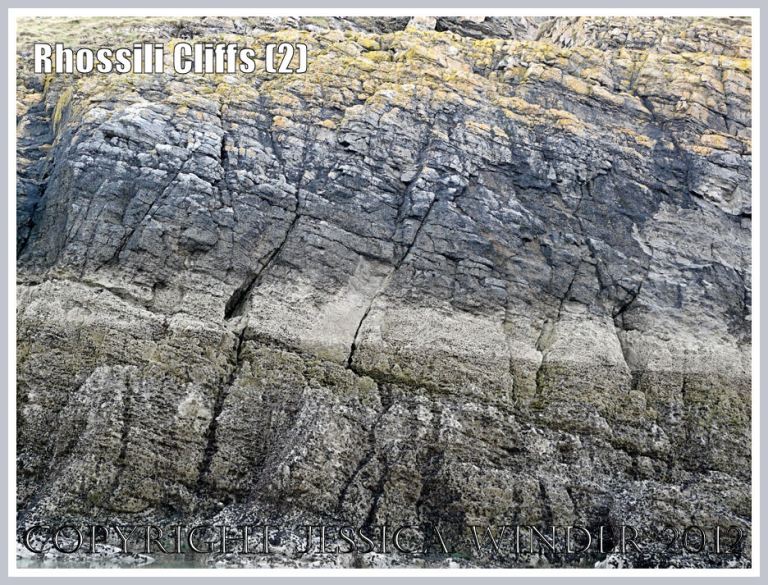 The cliff is characterised by massive strata, sometimes at a 45 degree angle; comprising layers of varying thickness up to almost a metre; and overlain by encrusting marine organisms arranged in horizontal bands of different colours from beach level to cliff top in rocky shore zonation.
