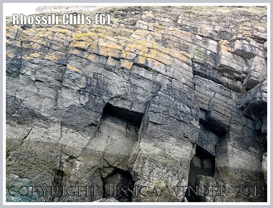 On top of the cliff lies the Viel, an ancient medieval strip field system, separating the village of Rhossili from the rocky, wave-cut platform which is a natural causeway to the Worms Head. In the cliff face, narrow clefts have been excavated by the sea – tall enough for a person to squeeze through. The walls inside are covered with a myriad of marine creatures taking advantage of the permanent moist conditions and relative shelter.