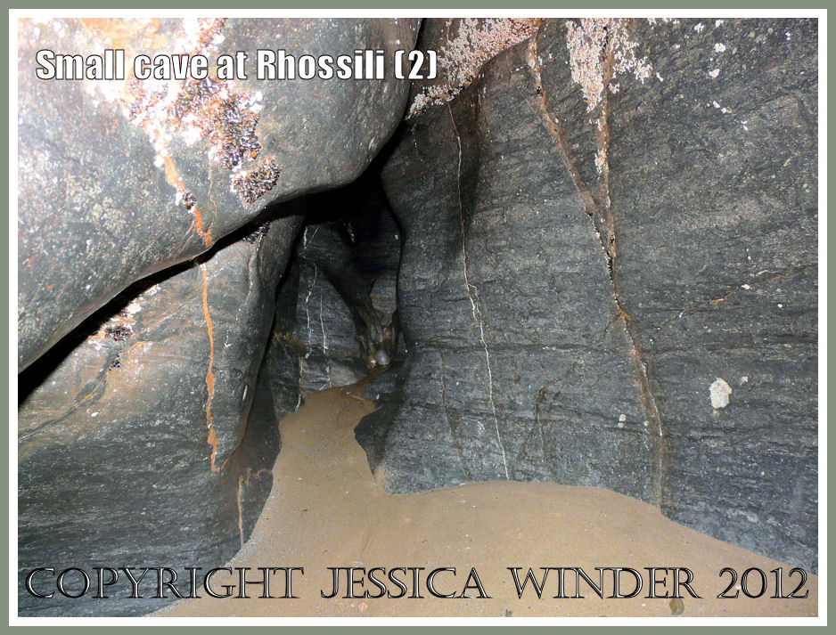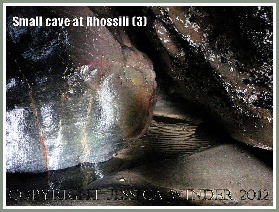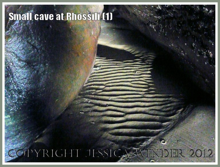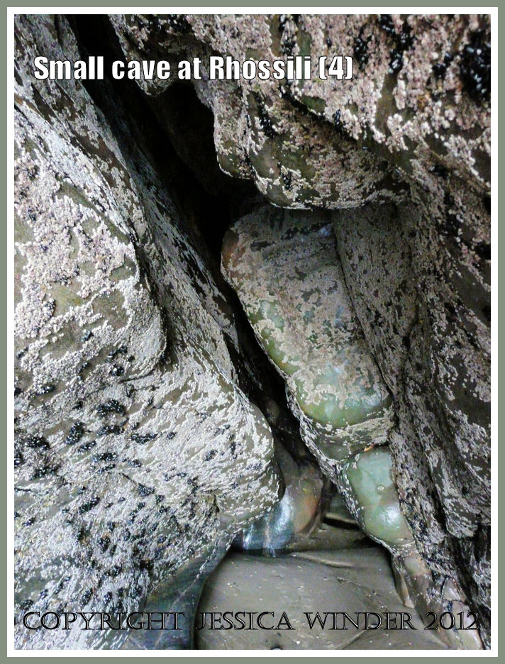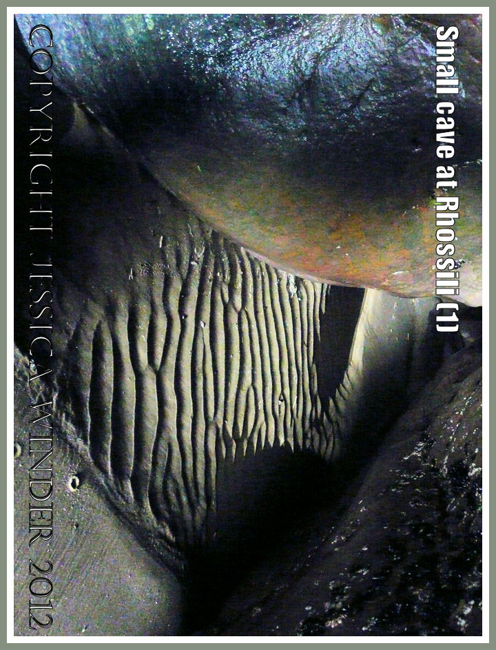 The roar of the waves is muffled to extinction. The rush of the wind is stilled. Quiet, except the echo of dripping water. Cool. Peaceful. Colours muted and calm. Smooth stone walls: grey, green, red. Bare without enough light for life. Dim light only glints on wet surfaces. Shallow pools with ripples like cockle shells on the sandy floor. Wave-worn passages in dark recesses. Boulders perch and balance at awkward angles. Solid rock for 50 metres above.
