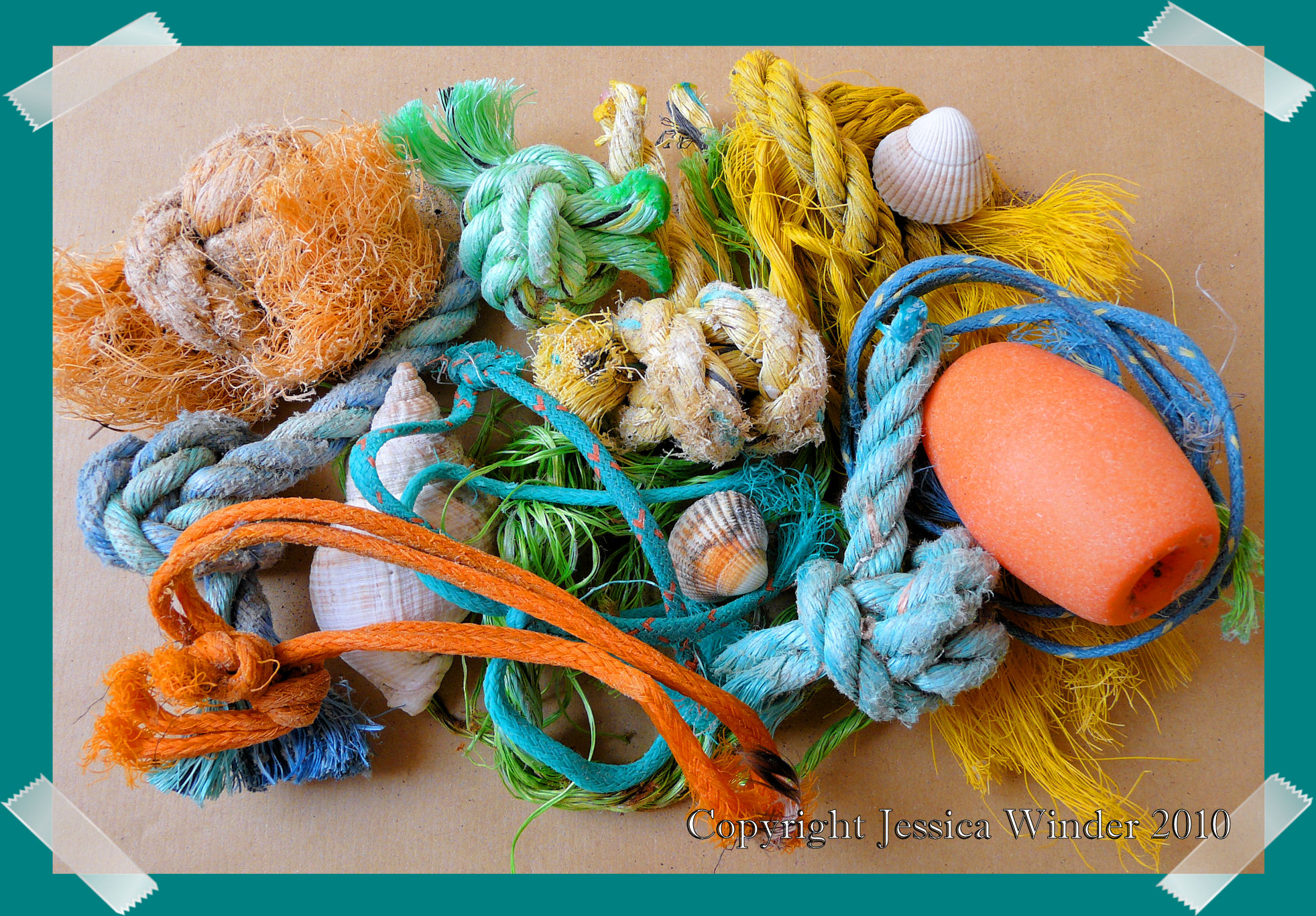 Just a snapshot of some beachcombing finds – pieces of blue, green, orange and yellow coloured and knotted rope, an orange plastic fishing float, and some seashells.