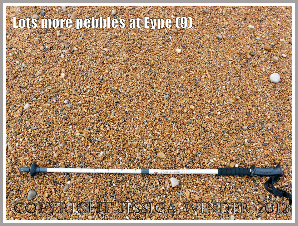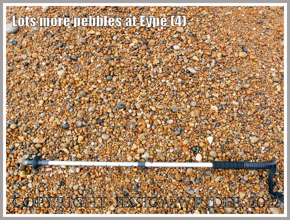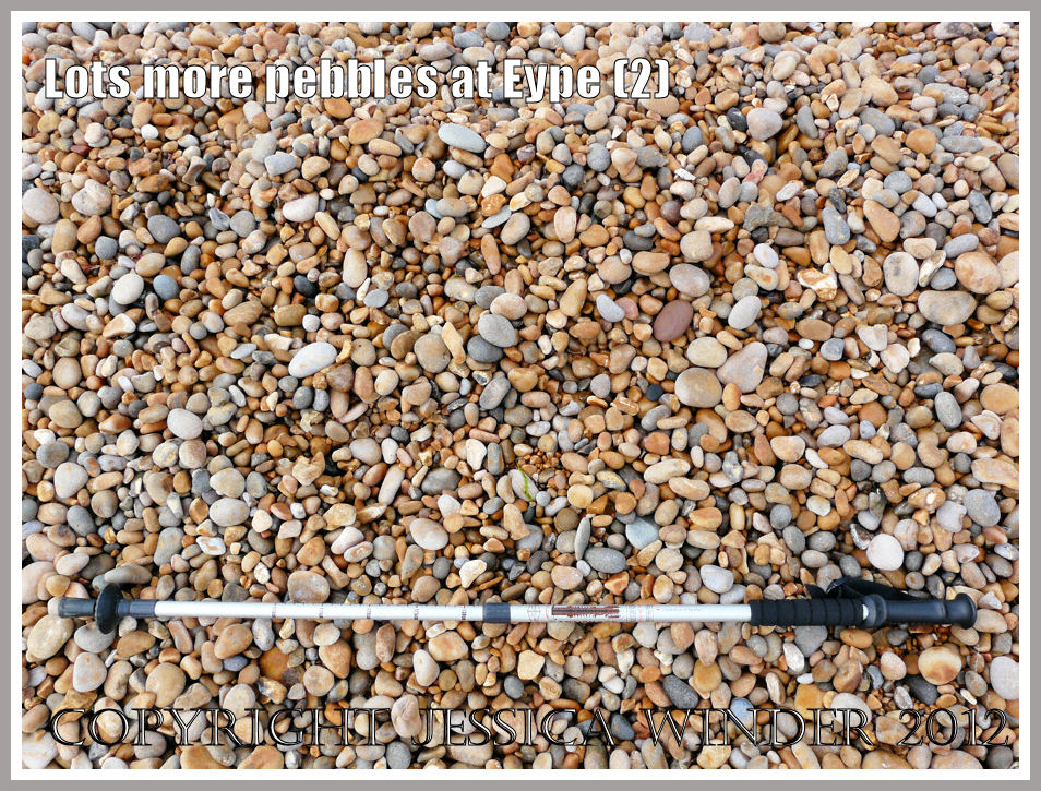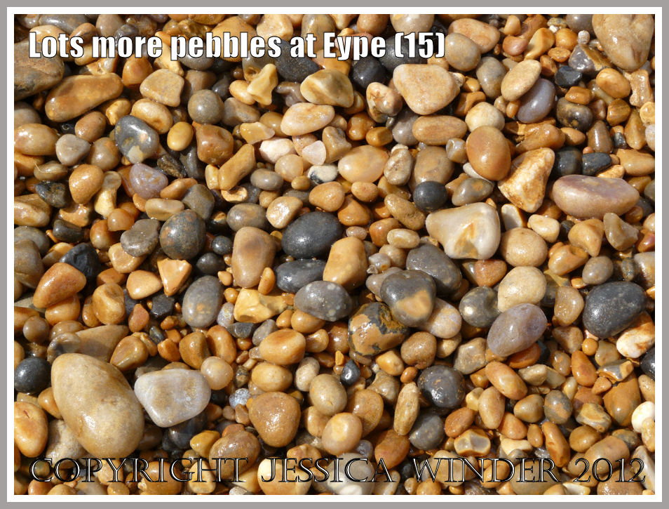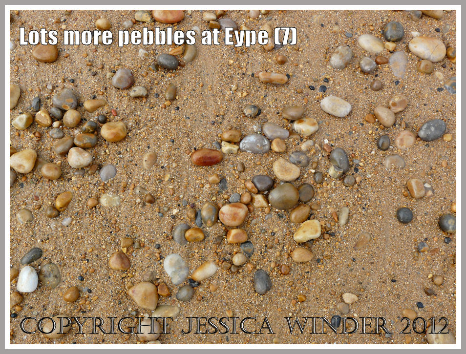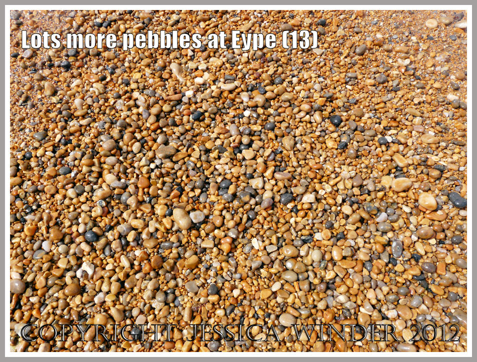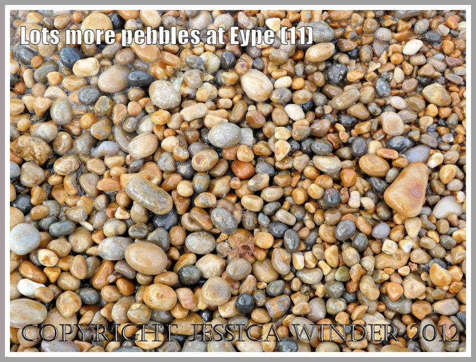 Pebbles on the beach at Eype, Dorset, UK on the Jurassic Coast. Photographs of shingle – wet, dry, big, small, assorted sizes, graded sizes, various shapes, different colours, orange pebbles, grey pebbles, black pebbles, pebbles with sand, pebbles washed by white seafoam, pebbles with a measuring scale, millions of pebbles in all.