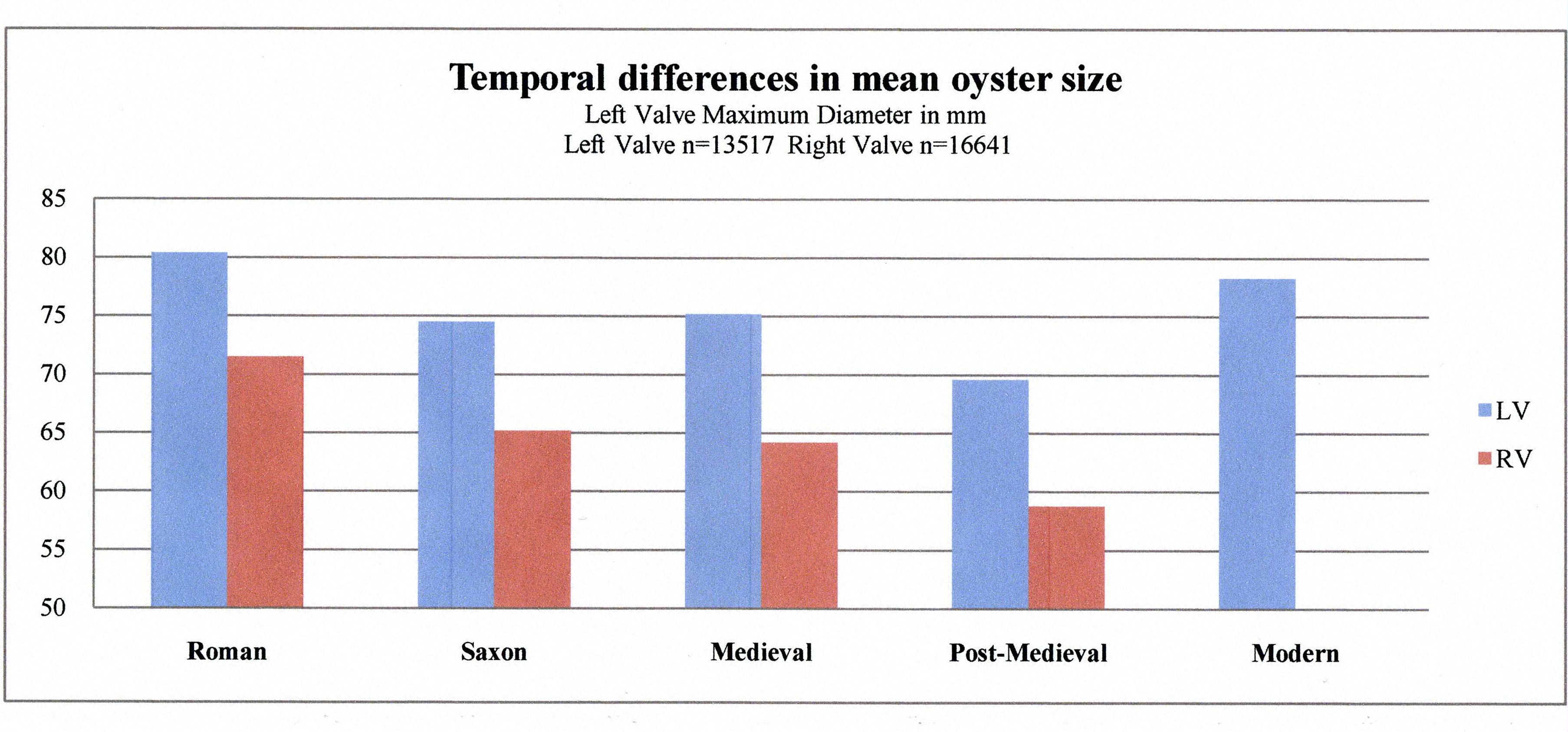 Comparisons of size for broadly defined historical periods reveal interesting variations in mean size between the Roman, Saxon, Medieval, Post-medieval and Modern oyster shells. This appears to indicate statistically significant temporal differences in the average size of oyster shells. Roman shells are largest but size decreases progressively through successive periods until a recovery to almost Roman dimensions in the Modern period. The data will be reworked using more sophisticated computer software and the much larger database that has been acquired since this analysis was first completed.