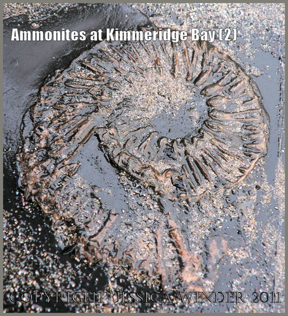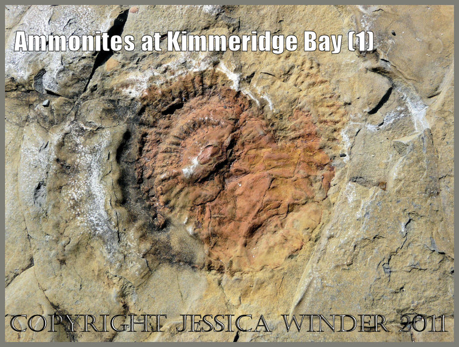 The photograph above shows a typical crushed ammonite shell fossil that you might come across at Kimmeridge Bay. It is colourful but not very distinct.