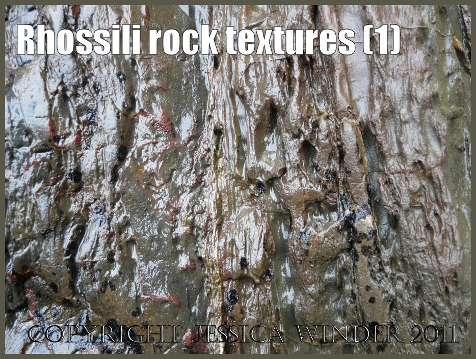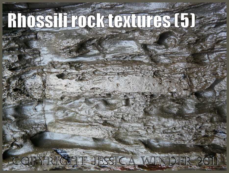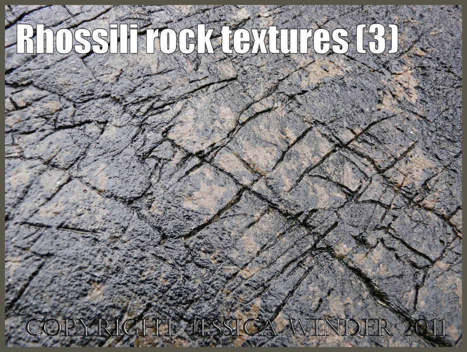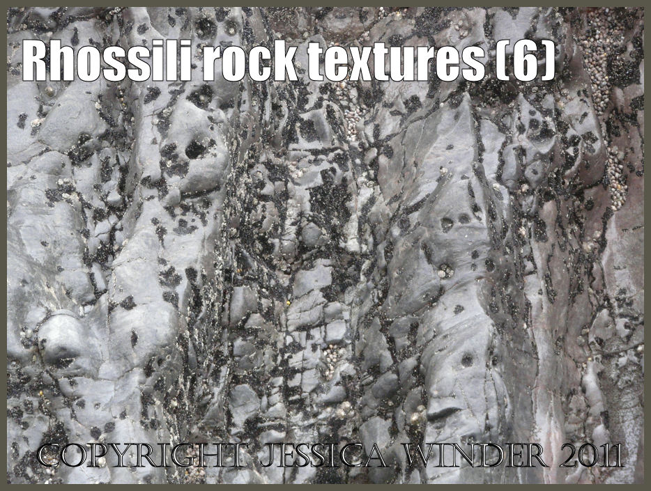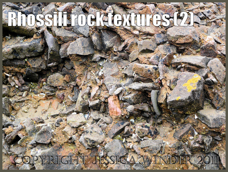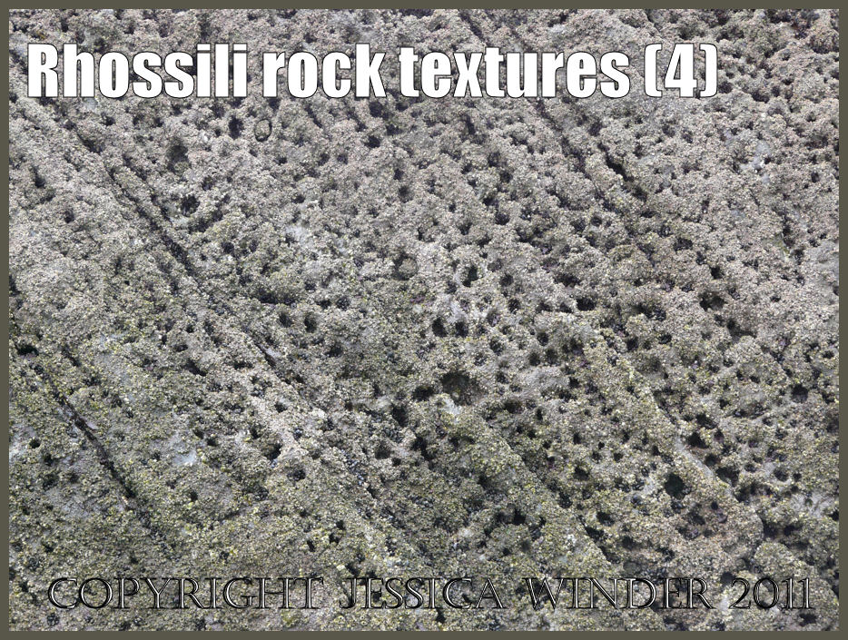 On the Gower Peninsula in South Wales, there is an amazing array of rock forms and surface textures in the cliff faces. Here are some examples from the south end of Rhossili Bay where the cliff edges the promontory that leads to Worms Head. The textures result from a combination of factors including the manner of deposition of the original sediments; the rock structure and layering or consolidation; the rock chemistry; erosion by weather and waves; and sometimes by biological activity (like erosion by endolithic lichens and the wearing away of circular depressions by limpets). Most of the rock textures shown here are from Carboniferous limestone with the exception of the brecciated conglomerate in the second photograph.