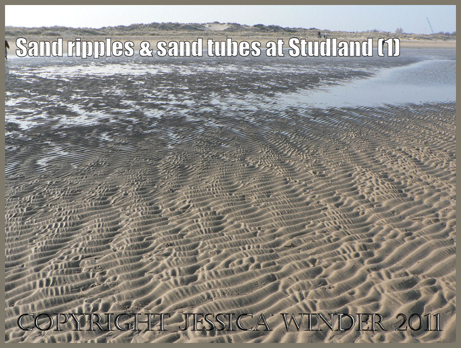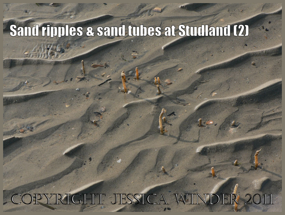 Here shown above from Studland, or rather just round the corner in Shell Bay, are some beautiful patterns in the sand. In the valleys between the scarps of sand, where the water lingered, there was a colony of upstanding sand tubes. These tubes are constructed from sand, shell fragments, and mucus by marine polychaete (many bristled) worms. The construction materials and the shape of the tube are clues to the specific identity of the worm.