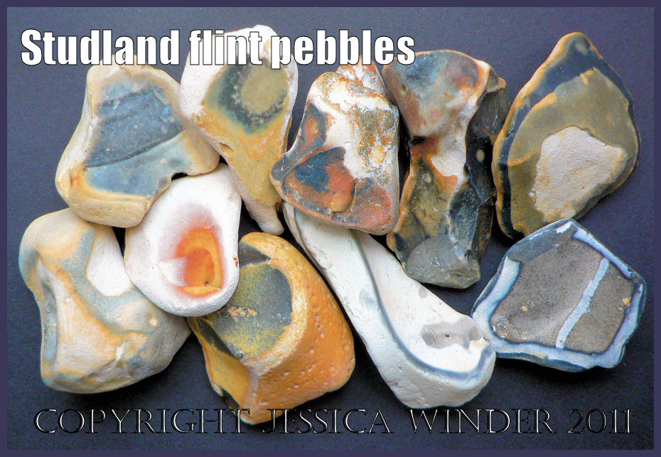 The ordinary and ubiquitous flint and chert stones beneath our feet can be beautiful if we only stop to look. Flint abounds on the seashores of the Jurassic Coast in Dorset. It assumes many shapes and colours – white, grey, black, orange, and brown. When it breaks, it reveals a never-ending variety of patterns and designs which are interesting and decorative. This photograph shows an assortment of small broken flint stones picked up on a walk along Studland Bay.