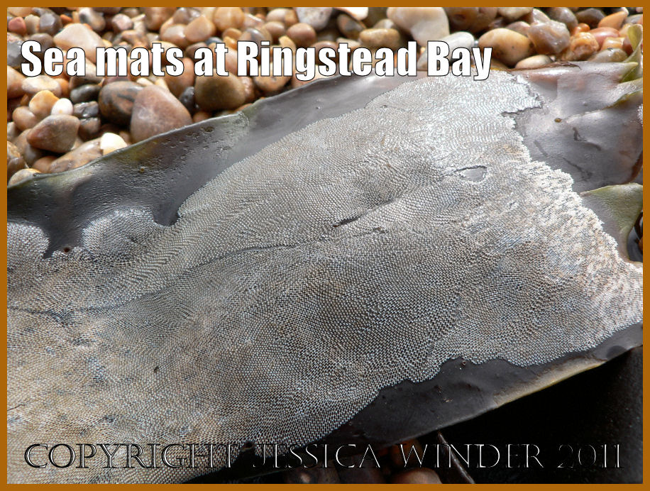 Less spectacular, and far more common, are the sea mats or Bryozoa that form a lace-like colony on seaweeds, shells and stones. An example of such a sea mat is shown in close-up below – again attached to a blade of kelp.