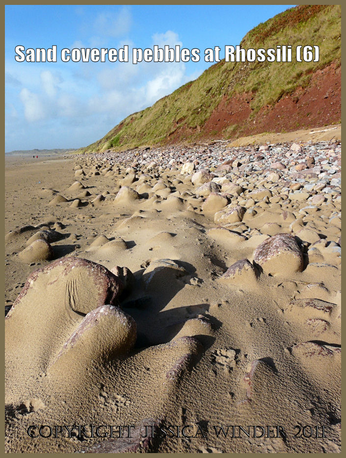 The dynamics of sediment movement on beaches intrigues me. Every time you visit a favourite beach it looks different. The tides, currents, wind and weather all play a part in the transformations. The structure of the seashore is sometimes hidden and sometimes revealed. Last autumn the pebbles at the foot of the soft red cliffs beneath Rhossili Down on Rhossili Bay in Gower, South Wales, were in the process of being covered up by sand.