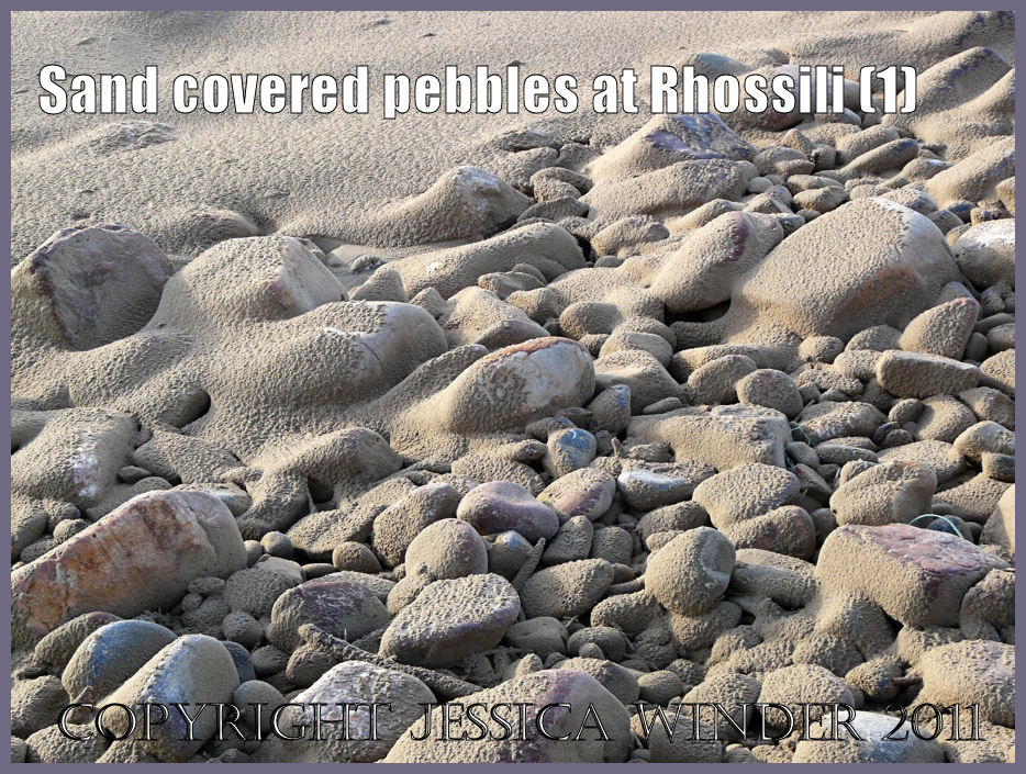 The texture and distribution of the sand showed that it had first been a wind-blown accumulation; then had been consolidated by rain; and at that particular moment it was drying out and beginning to crack over the curved surfaces. The images illustrate the contrast in textures and colours between the sand and the pebbles. The surface of the sediment layer mimicks the pebble shapes below. The overall effect is one of softening of the appearance of the pebbles as if they had been covered by a light blanket of drifting snow.