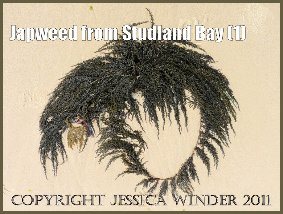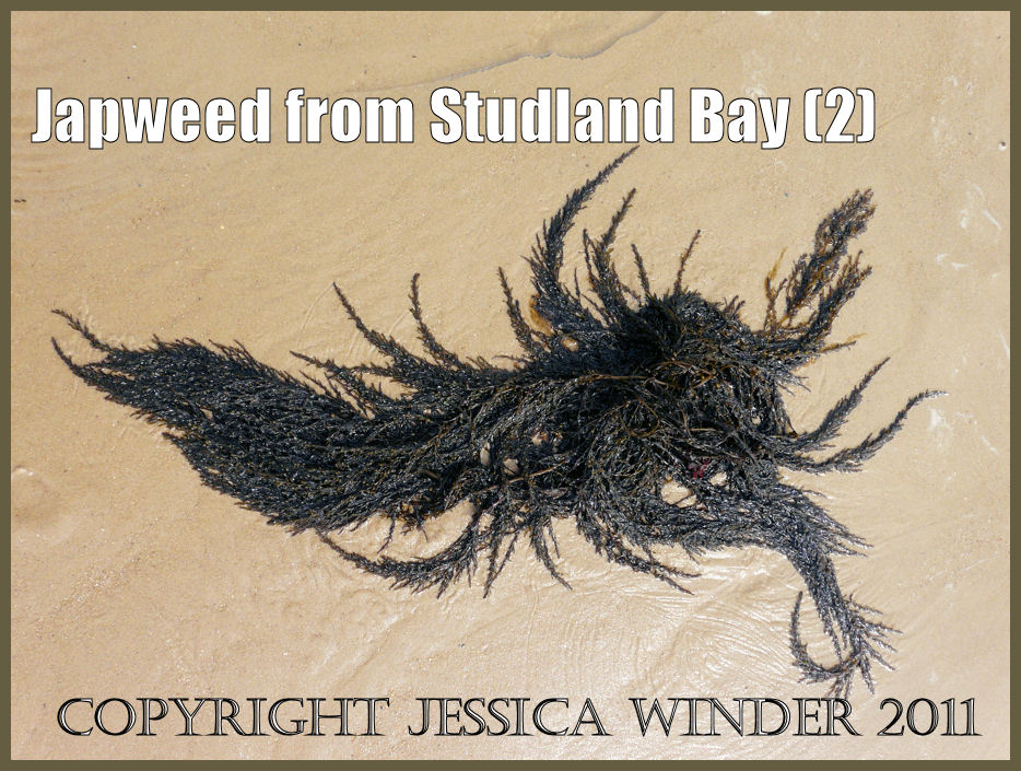 In April, the sea washed up lots of Japweed, Sargassum muticum (Yendo) Fensholt, onto the sandy seashore at Studland Bay, Dorset. The stem of this brown alga measures upto a metre with short regular alternate branches bearing small ‘leaves’, and round gas bladders. These long strings of seaweed made some interesting patterns on the beach – some like tousel-headed or bearded faces, some like multi-legged sea creatures.