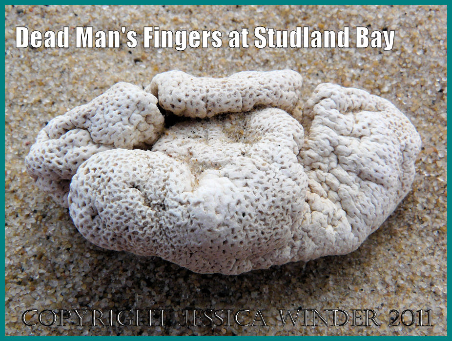 Dead Man’s Fingers, Alcyonium digitatum (Linnaeus), is a soft coral. This one was washed up by the sea onto the sandy shore at Studland Bay, Dorset. Each of the holes or pores would have originally housed a small living animal in this colonial organism. Each tentacled polyp (a bit like a sea anemone in construction but very small) is embedded in a common spongey mass that is made stiff by the inclusion of minute chalky or calcareous spicules. An important feature for identification in live specimens is the fact that the polyps are usually the same colour as main surface.