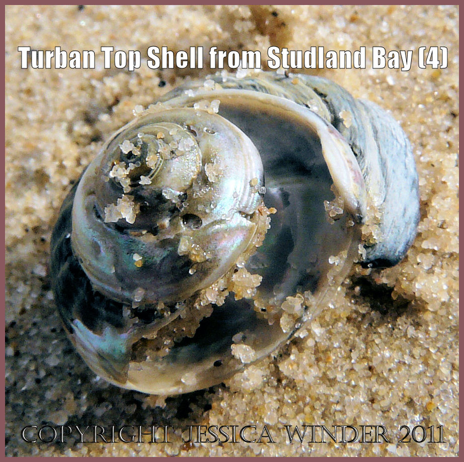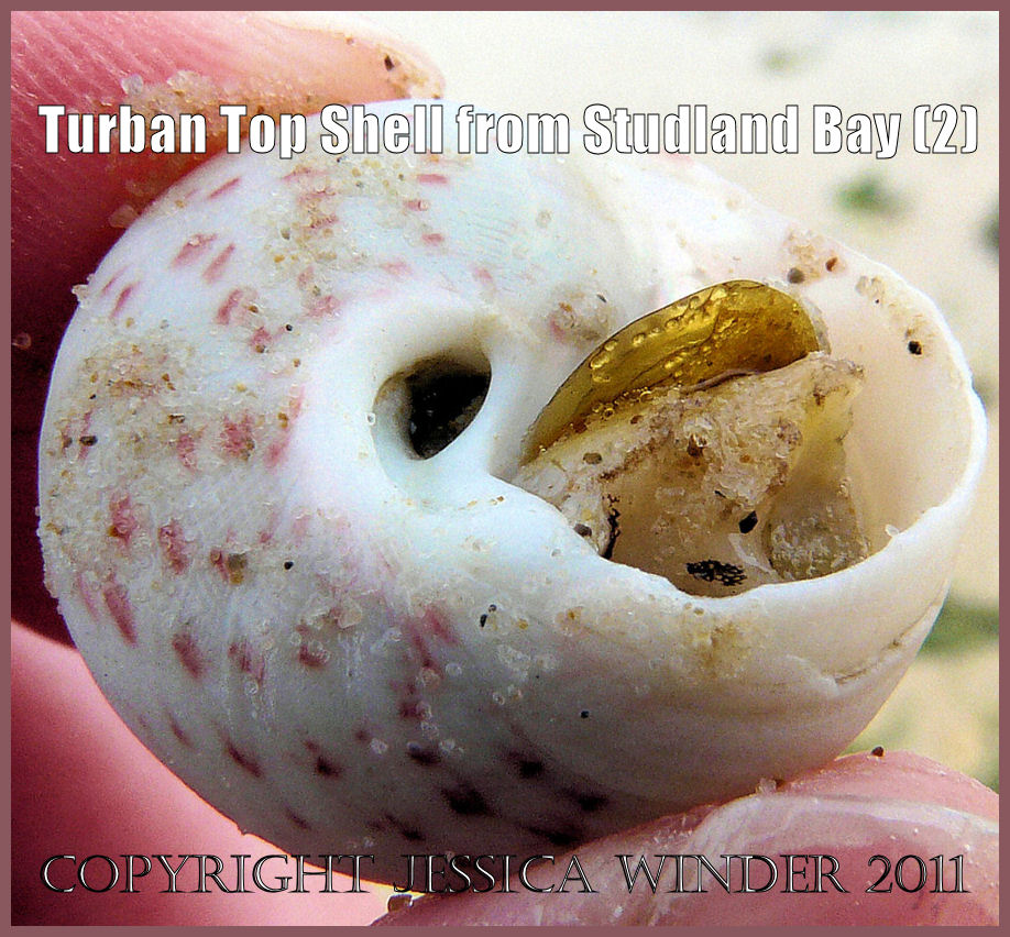 Seashell picture: The underside of a living Turban Top Shell, Gibbula magus (Linnaeus), washed ashore on the National Trust owned beach at Studland Bay, Dorset, UK on the Jurassic Coast World Heritage Site (P1080840aBlog2)
