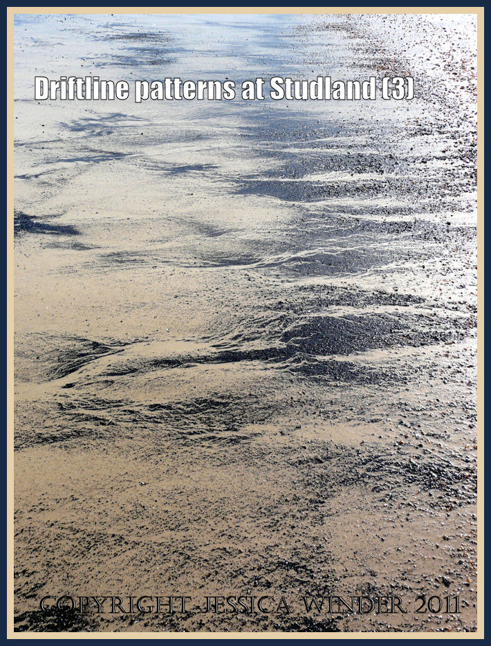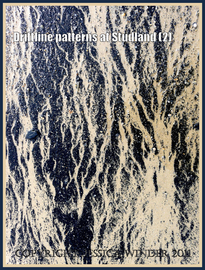 This picture shows in detail the driftline pattern composed of small pieces of what looks like charcoal. The action of the waves not only deposits these black fragments on the shore as each tide recedes but also creates dendritic patterns with them.