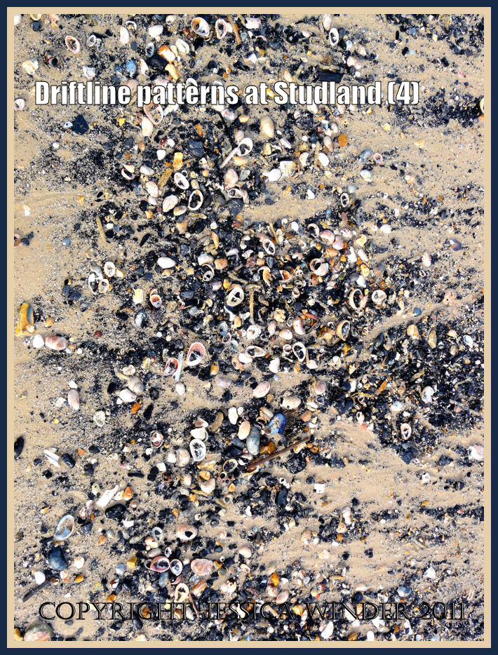 In some places, slipper limpet and other empty shells have accumulated with the charcoal adding a bit of colour to the driftline.