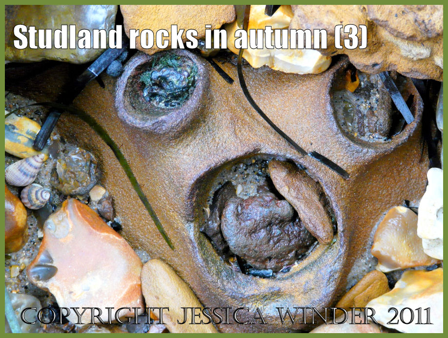 The geological features that particularly interested me on this visit, were the vertically aligned iron-lined tubes or ‘pipes’ embedded on the sandstone. These ‘pipes’ can be seen projecting upwards from the rocks beneath your feet on the beach; in vertical half-sections in broken boulders on the seashore; and also in the eroded cliff face. Holes of different sizes leading into ‘pipes’ can be seen all over the place. Sometimes, the pipes are hollow and empty; and other times they are filled with hardened sediment. The range of colours can be most varied around these ‘pipes’ as you will see from the photographs below.