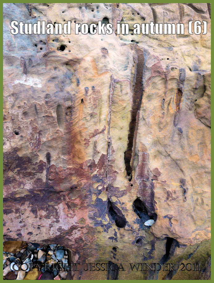 In these posts I can merely draw attention to these fascinating rocks. On the dull autumn day that I photographed them, in the absence of direct sunlight and reflection, the colours seemed to be particularly vivid and intense. Every shade is exhibited from cream, through orange, to deep red and purple. The rocks mostly get their rainbow hues from the iron minerals in the strata. One person who has investigated and written in great detail about the geology of Studland and the rest of the Jurassic Coast is Ian West. For a full account of the geology of this area, I recommend that you visit Ian’s site by clicking here.